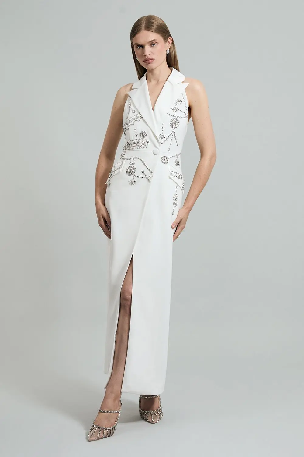 Crystal Embellished Cady Sleeveless Blazer - Ivory - This statement blazer dress represents Karen Millen's signature blend of sophisticated tailoring with glamorous detailing. The sleeveless design showcases your arms beautifully while the structured shoulders create a refined silhouette. Perfect for formal occasions, style with minimal jewellery to let the dazzling crystal embellishments take centre stage. For race day events, pair with an elegant fascinator and strappy heels, or wear to evening functions with a sleek updo and clutch bag. The floor-length cut with side slit offers graceful movement as you walk, while the open back detail adds an unexpected contemporary element. This versatile piece transitions effortlessly from summer weddings to winter galas with appropriate accessories, making it a standout investment for your occasion wardrobe. Sleeveless blazer silhouette with sophisticated collared neckline and single button fastening Exquisite crystal embellishment in an ornate pattern across the front panels Floor-length design with an elegant side slit Practical side pockets Striking open back detail