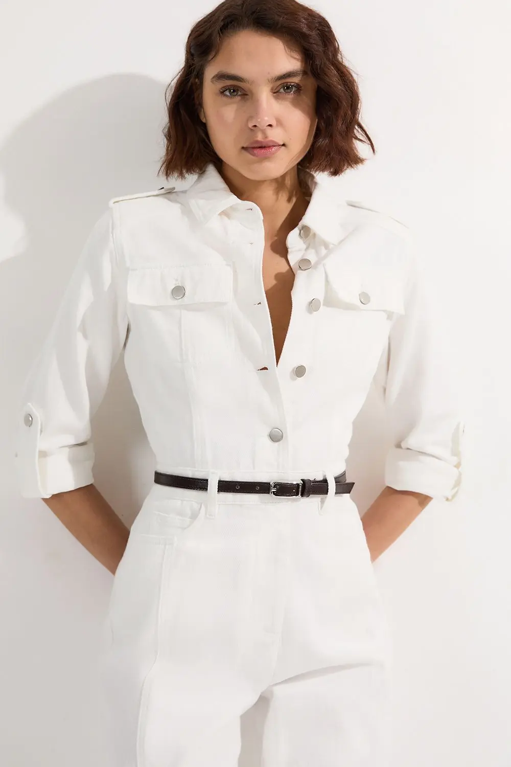 Denim Boiler Jumpsuit - Ivory - This Karen Millen denim boiler jumpsuit combines practicality with contemporary style. The all-in-one design offers effortless dressing with its classic collared neckline and button-through front. Style with a slim leather belt to define the waist and pair with heeled sandals for casual gatherings. For cooler days, layer with a lightweight turtleneck underneath or add a cropped jacket. The cotton-rich fabric provides comfort whilst maintaining structure throughout wear. Perfect for family brunches, weekend outings, or styled with trainers for a relaxed daytime look. For the evening, swap flat footwear for block heels and add statement jewellery to transform this versatile piece. Collared neckline with classic button-through front design Functional chest pockets with button closure Roll-up sleeves with button tab fastening Regular fit silhouette with a defined waist when belted Practical side pockets for everyday convenience