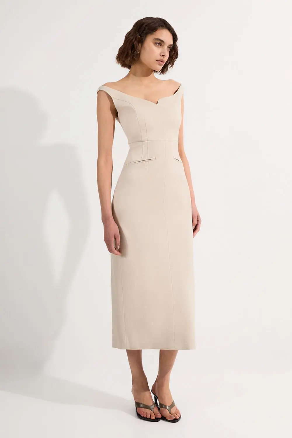 Tailored Marl Strappy Pencil Maxi Dress - Neutral - The Karen Millen Tailored Marl Strappy Pencil Maxi Dress presents a masterclass in understated daywear elegance. The off-shoulder design creates a flattering neckline that showcases your decolletage, whilst the tailored silhouette gently skims your curves for a refined look. Style this versatile piece with flat leather sandals as seen on our model for casual family gatherings or weekend brunches. For a more polished daytime ensemble, pair with block-heeled mules and a structured tote. The midi length offers a contemporary twist on the classic pencil dress, making it suitable for gallery visits or upscale lunch dates. The subtle marl texture adds depth to this seemingly simple design, whilst the back vent ensures comfort throughout the day. This dress effortlessly bridges the gap between casual and smart-casual occasions. Elegant off-shoulder design with a distinctive sweetheart neckline Figure-enhancing tailored pencil silhouette that contours the body Sophisticated marl fabric with subtle texture for added visual interest Practical side pockets discreetly integrated into the streamlined design Back vent detail for ease of movement and refined finishing touch