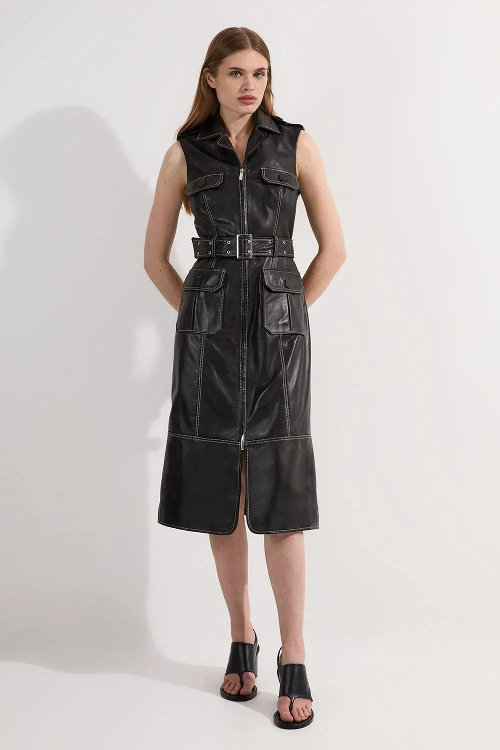 Leather Contrast Stitch Belted Sleeveless Midi Dress - Black - This Karen Millen leather midi dress features distinctive contrast stitching and utilitarian details. The structured collared neckline and belted waist create a flattering silhouette that celebrates feminine strength. Style with chunky black leather sandals as seen on our model for daytime outings, or pair with white trainers and a crossbody bag for weekend brunches. For cooler days, layer over a fitted turtleneck and add ankle boots for an effortlessly chic ensemble. The versatile midi length works beautifully for family gatherings or casual lunch dates. This standout piece transitions seamlessly from day to evening, simply swap your footwear and add statement jewellery to refresh your look for dinner plans. Crafted from genuine leather with striking contrast stitching for a bold, contemporary edge Sleeveless silhouette with a smart collared neckline and full-length front zip closure Statement belted waist with a rectangular buckle that defines and flatters your figure Four practical utility pockets with button closures add functional detail to the design Midi length with a subtle front split that allows for ease of movement