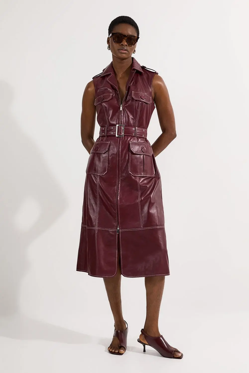 Leather Contrast Stitch Belted Sleeveless Midi Dress - Red - This Karen Millen leather midi dress features distinctive contrast stitching and utilitarian details. The structured collared neckline and belted waist create a flattering silhouette that celebrates feminine strength. Style with chunky black leather sandals as seen on our model for daytime outings, or pair with white trainers and a crossbody bag for weekend brunches. For cooler days, layer over a fitted turtleneck and add ankle boots for an effortlessly chic ensemble. The versatile midi length works beautifully for family gatherings or casual lunch dates. This standout piece transitions seamlessly from day to evening, simply swap your footwear and add statement jewellery to refresh your look for dinner plans. Crafted from genuine leather with striking contrast stitching for a bold, contemporary edge Sleeveless silhouette with a smart collared neckline and full-length front zip closure Statement belted waist with a rectangular buckle that defines and flatters your figure Four practical utility pockets with button closures add functional detail to the design Midi length with a subtle front split that allows for ease of movement