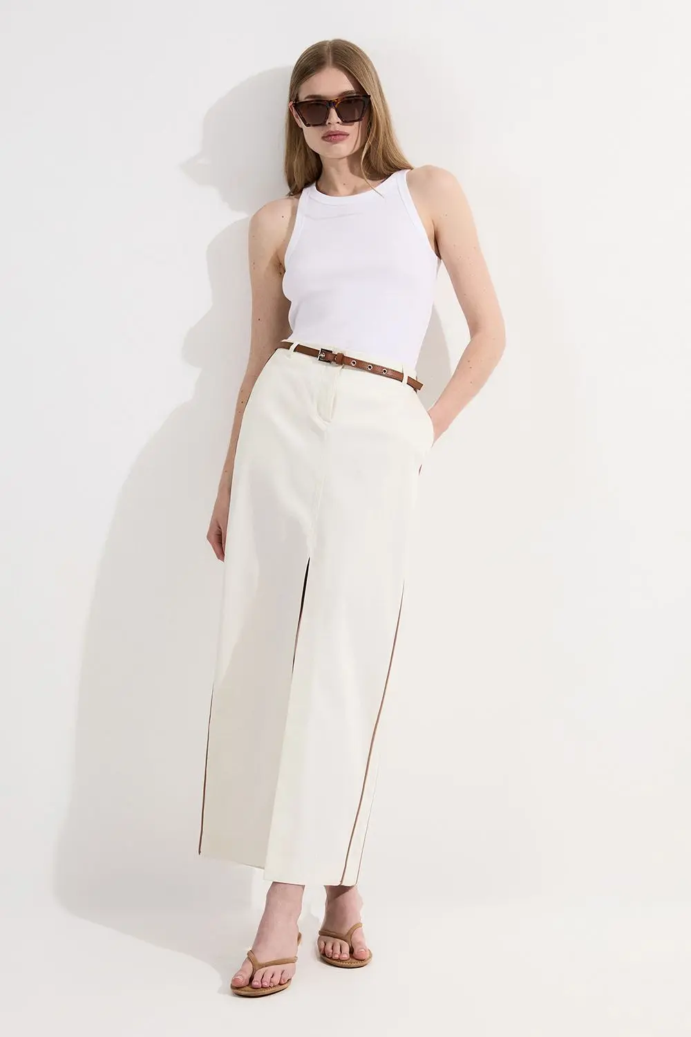 Archive Collection - Tailored Denim Belted Pocket Detail Maxi Skirt - Ivory - Archive Collection - Tailored Denim Belted Pocket Detail Maxi Skirt
