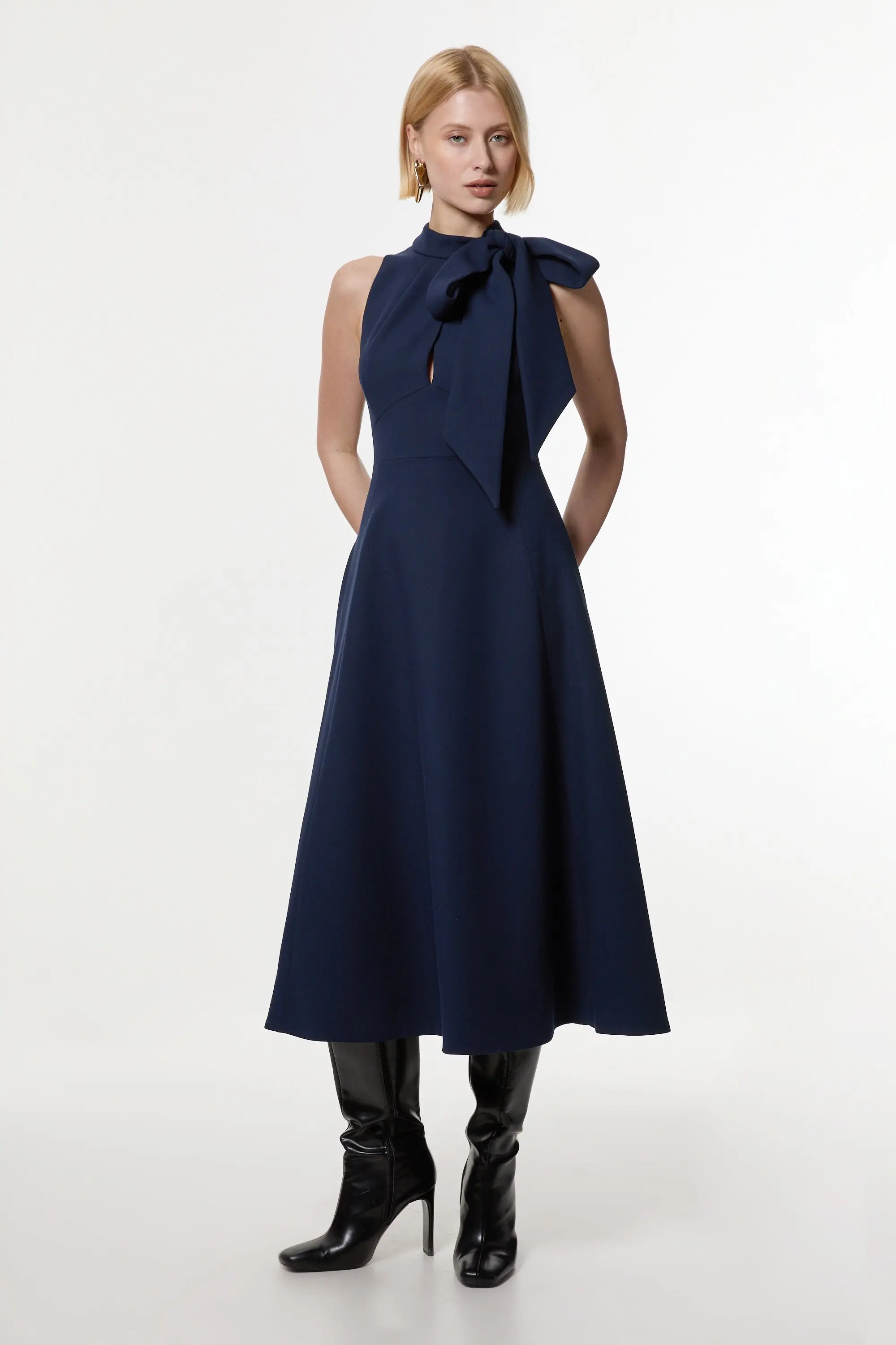 Compact Stretch Bow Tie Neck Full Skirted Midi Dress - Navy