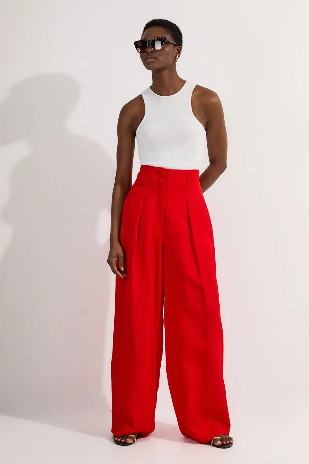 Tailored Viscose Linen Wide Leg Trouser - Red