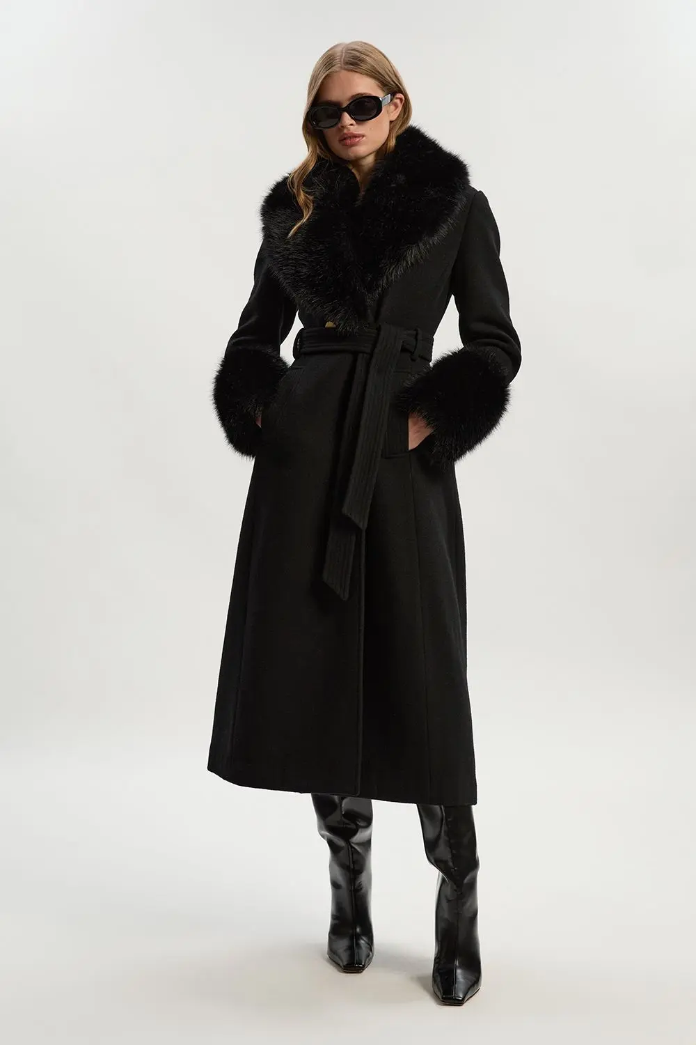 Wool Blend Detachable Faux Fur Belted Midi Coat - Black