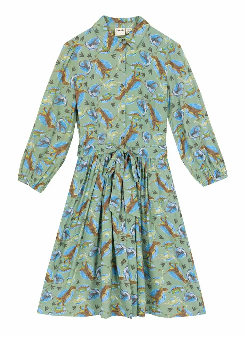 Andi’s back from extinction in a roarsome new dinosaur print! This fully-lined shirt dress is made from our favourite fabric with Livaeco™ Viscose fibres in an all-over hand-drawn dinosaur print inspired by children's illustrations on a sage green background. Featuring a classic collar, three-quarter length sleeves with elasticated cuffs, a functional half button-through placket, an adjustable sash belt, and a gathered-on skirt with pockets at the hips, Andi is bound to be a T-rex-cellent addition to your everyday wardrobe.Aishwarya is 5'10.5 and is wearing a UK size 10Sofie is 5'8 and is wearing a UK size 16Regular fit - take your usual sizeUK Size 10 dress length: 102cmAll-over illustrated dinosaur print Classic shirt dress shapeThree-quarter length sleevesButton-through frontPocketsFor specific measurements of this garment, please see the Size Guide.