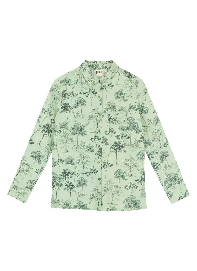 Unbe-leaf-able. The Sharon Shirt is made from our favourite lightweight fabric with Livaeco™ Viscose fibres in an all-over vintage-inspired illustrated tree print on a green background. Featuring an oversized fit with a classic collar, a functional button-down front with horn-effect buttons, a front patch pocket, long sleeves with buttoned cuffs, and a slightly dropped back hem, Sharon is the easy-going blouse that we can’t get enough of.Aishwarya is 5'10.5 and is wearing a UK size 10Oversized fit - take your usual sizeAll-over tree print Classic collarLong sleevesButton-through frontPatch pocketDropped back hemFor specific measurements of this garment, please see the Size Guide.