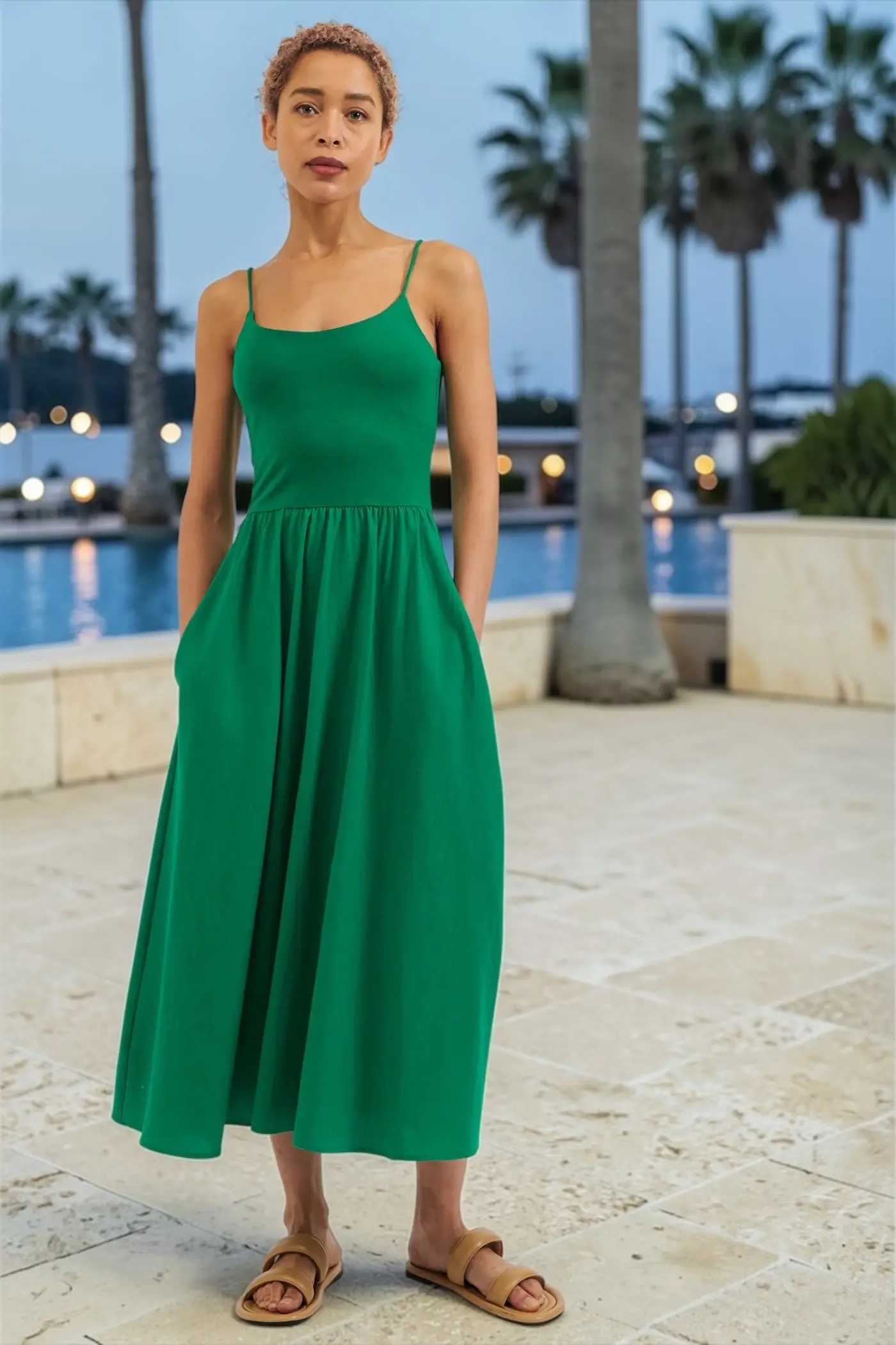 Introducing the Soumia Midaxi emerald green strappy dress. Featuring a jersey bodice an full recycled cotton skirt. if you have to commit to one dress this summer this is the one. Dress it up or down, suitable for any occasion.. Elastic Straps. Sustainable. Side seam pockets.. Bodice: 93% COTTON 7% ELASTANE Skirt 100% RECYCLED COTTON. Cool machine wash. Wash with similar colours. Do not bleach. Do not tumble dry. Warm iron on reverse.. Model is 5ft 8"/173cm tall and wears a size 8UK