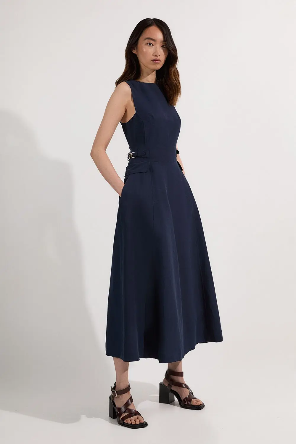 Premium Linen Tab Waist Detail Full Skirt Tailored Midi Dress - Navy - Experience everyday elegance in our midi dress, made with summer ready linen fabric, with a fit and flare silhouette and tab details designed to cinch the waist. Style it with sandals or court heels for a look that will take you from summer office days to date nights. Premium Linen Tab Waist Detail Full Skirt Tailored Midi Dress High Quality Linen Fabric Flattering Fitted Bodice Dramatic Flared Skirt Unique Tab Accents on Waist Pocket Detailing Sleeveless Design Zip Fastening in Back