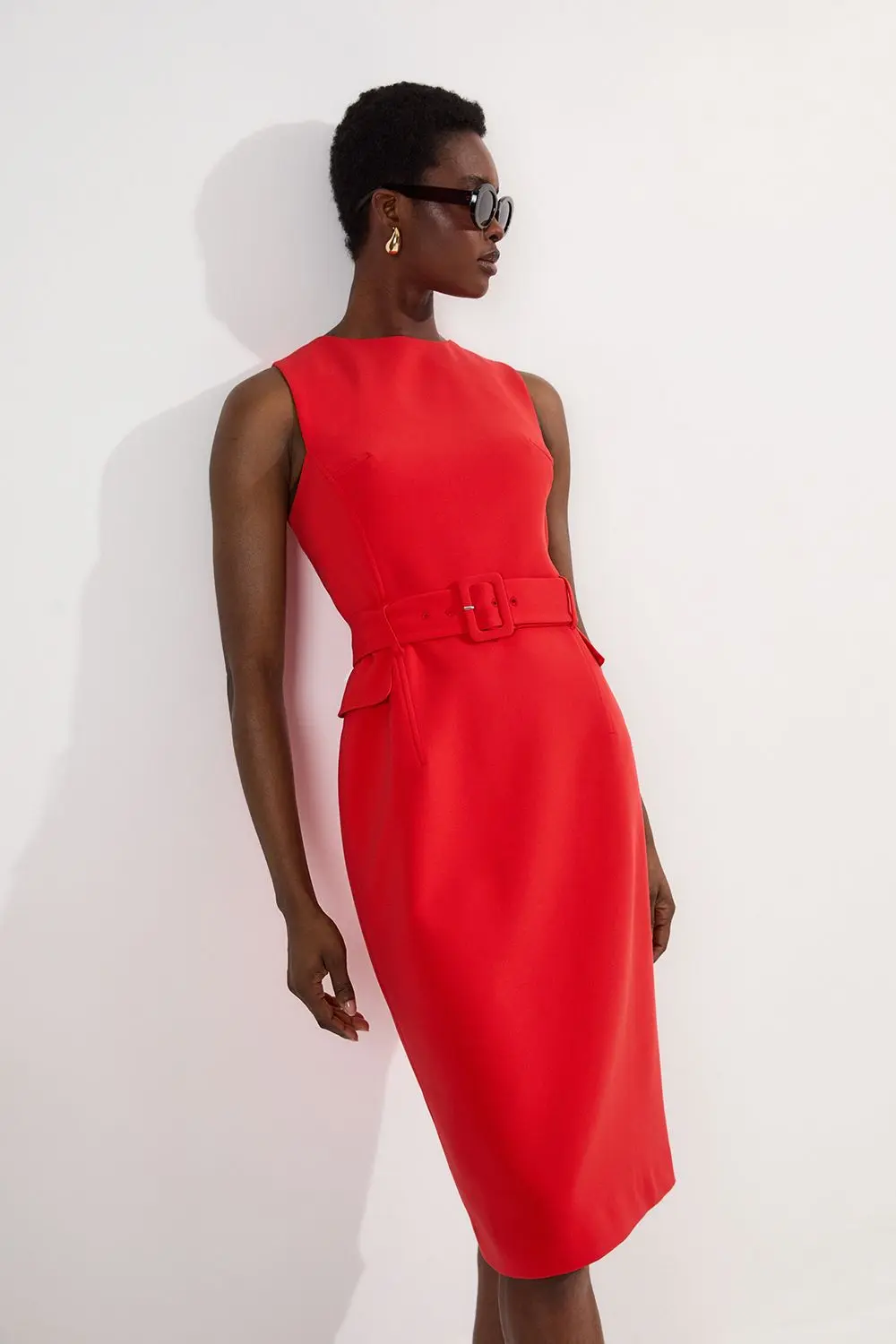 Compact Essential Belted Tailored Midi Dress - Red - This Compact Essential Belted Tailored Midi Dress from Karen Millen presents a masterclass in refined daywear. The clean lines and structured silhouette create a polished look that transitions effortlessly from office to weekend engagements. For daytime gatherings, pair with pointed ballet flats and a structured tote bag for an ensemble that conveys quiet confidence. The versatile midi length works for family lunches, gallery visits, or casual networking events. The belted waist detail allows for customised styling - wear cinched for a defined silhouette or remove for a more relaxed approach to tailored dressing. Tailored midi dress with a round neckline Matching fabric belt with statement buckle Sleeveless design Practical side pockets Refined back vent
