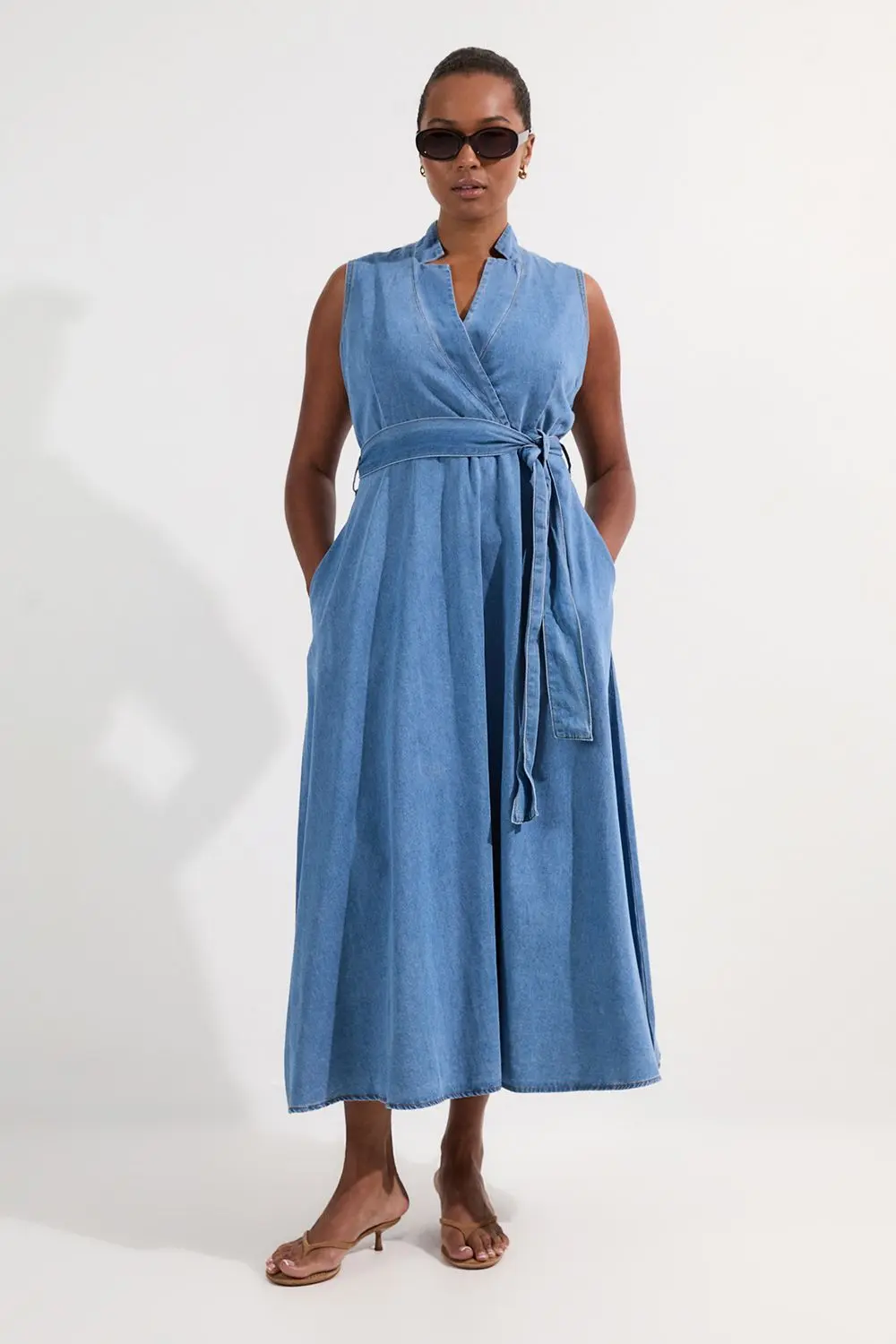 Plus Size Denim Tailored Notch Neck Belted Fluid Midi Dress - Mid Blue - Plus Size Denim Tailored Notch Neck Belted Fluid Midi Dress