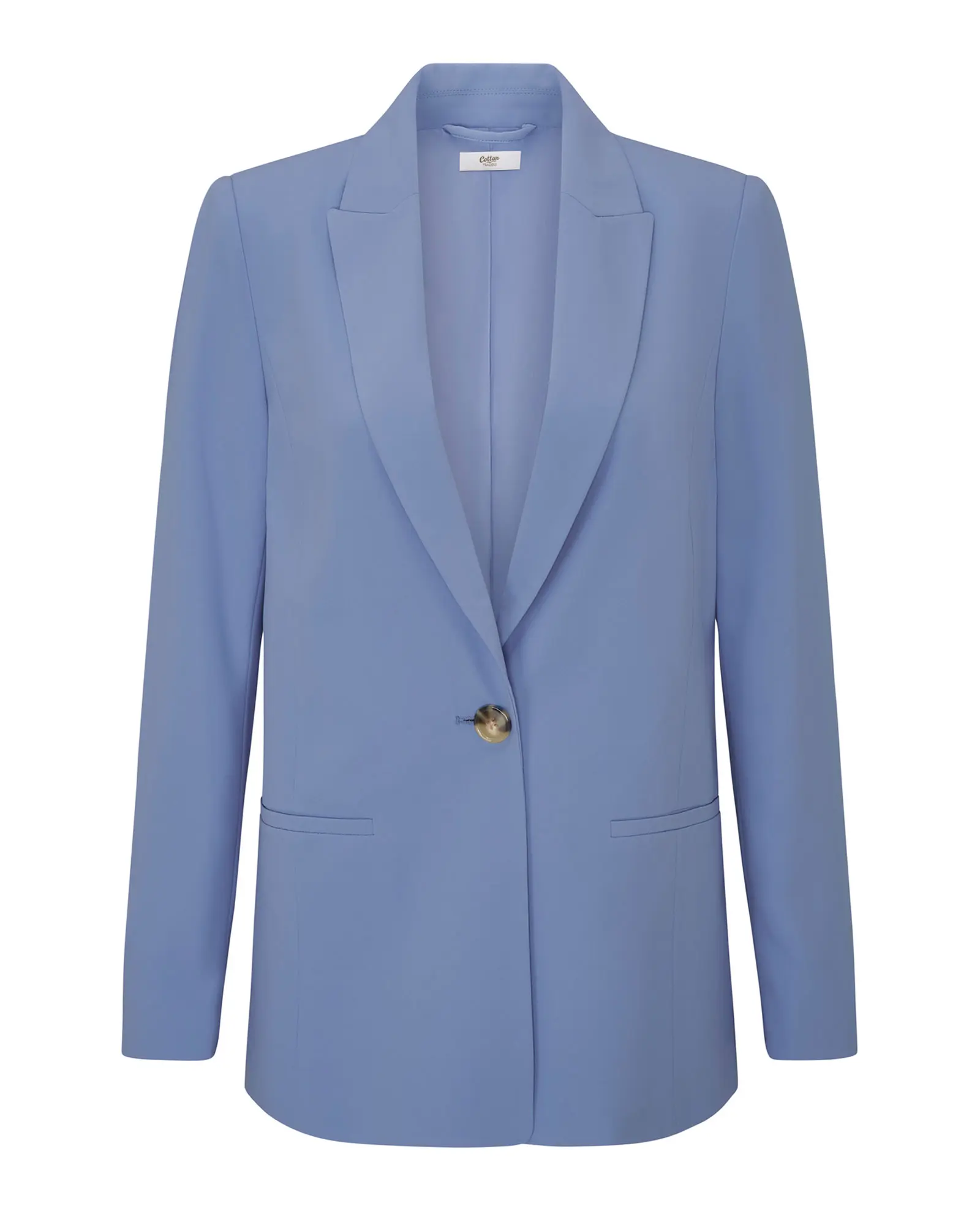 Single breasted Collar and lapel Functional welt pockets to lower body with mock horn button fastening Shoulder pads Long set-in sleeves Fully lined This soft blazer is an eye-catching staple you'll find yourself reaching for time and time again. Cut into a single-breasted silhouette, shoulder pads offer a gentle structure while the lined finish makes it the ultimate warm-weather must-have. Button-fastening welt pockets to the lower body complete the look. Machine Washable100% Polyester | Cotton Traders Women's Soft Lined Blazer in Blue, 100% Polyester, Size 8