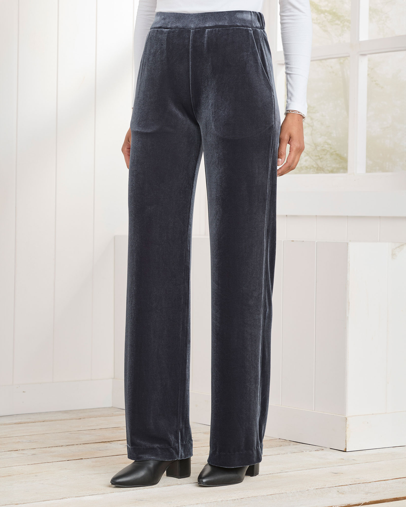 Cotton Traders Women's Pull-On Wide Leg Velour Trousers in Grey, Polyester/Elastane