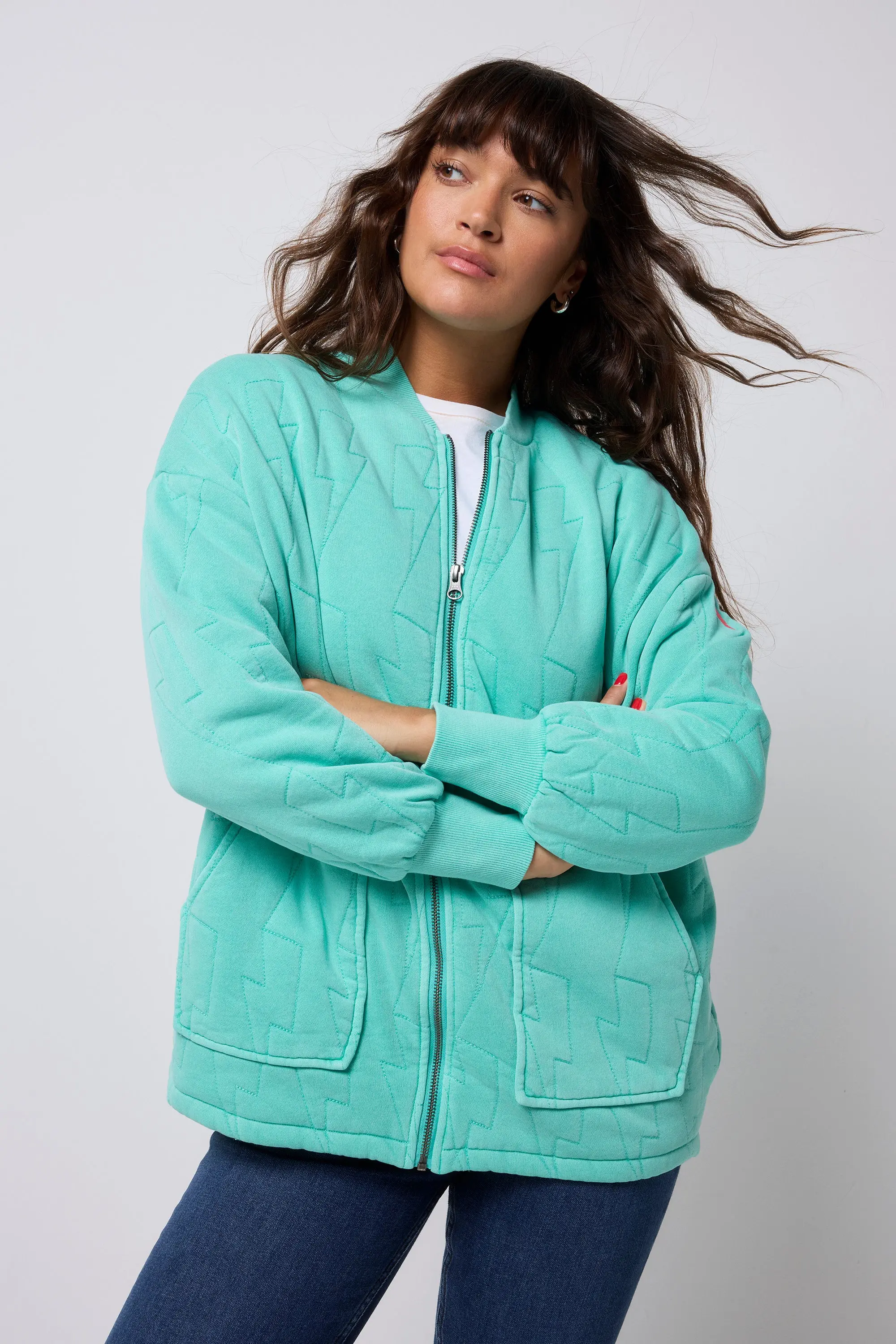 Repeat after us: you need this turquoise quilted bomber jacket in your life. It's the ultimate light layer, designed to become your go-to. With its distinctive elasticated back hem, roomy fit, and handy side pockets, you might just find yourself leaving your other jackets behind. Organic cotton Quilted lightning bolt detailing Oversized fit - for a more fitted look, try sizing down Dropped shoulders Side pockets Signature neon pink embroidered lightning bolt on the sleeve Please note that this product is garment dyed so there can be some variations in trim and fabric colour due to the over dyeing process Model in the image is Size 8 Height 5'8 Wearing a 6/8 - XS