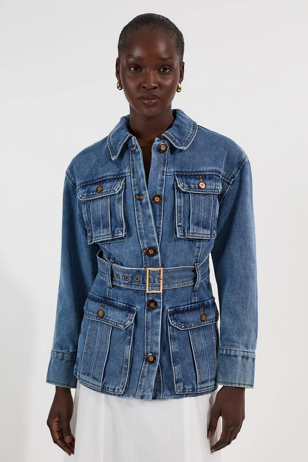 Denim Pocket Detail Belted Safari Jacket - Mid Blue