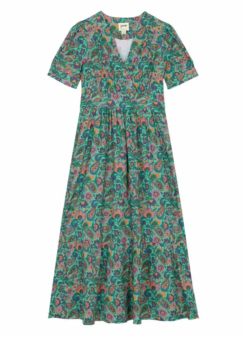 Paisley perfection. The Albertine Dress is made from our favourite fabric with Livaeco™ Viscose fibres in an all-over wasabi green Jaipur-inspired paisley print and features a wrap-style neckline with pleats at the bust and waistband, short puff sleeves with button fastenings, a tie-back detail to nip in the waist, and a midaxi-length skirt with a deep ruffle tiered hem. Grace is 5'10 and is wearing a UK size 10Regular fit - take your usual sizeUK Size 10 dress length: 140cmAll-over wasabi green paisley printWrap-style necklineUnlinedShort sleeves with button cuffsPocketsFor specific measurements of this garment, please see the Size Guide.