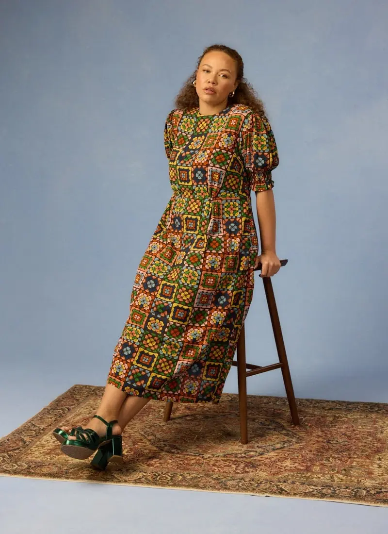 Boho style is easy with Flora in our wardrobes! This vintage-inspired midaxi dress is made from breezy moss crepe fabric with Livaeco™ Viscose fibres in an all-over 1970s-inspired crochet granny square print on a retro dark brown background. The Flora Dress also features a round neckline, a keyhole back neck fastening with self-fabric covered buttons, voluminous short puff sleeves with elasticated cuffs, pleats at the front bodice and skirt, elasticated shirring at the back waist, and an invisible side seam zip. Mia is 5'8 and is wearing a UK size 10Blaise is 5'8 and is wearing a UK size 16Regular fit - take your usual sizeUK Size 10 dress length: 125cmAll-over patchwork floral printBlack backgroundRound necklineVoluminous short puff sleevesUnlinedMidaxi lengthFor specific measurements of this garment, please see the Size Guide.