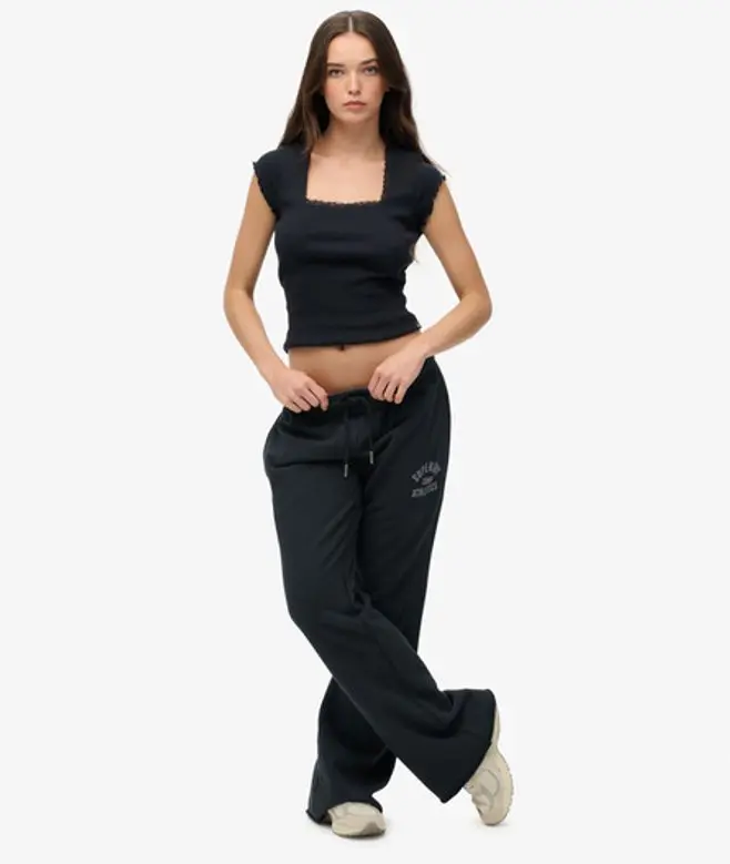 Slim Fit. With enough room to move, slim fit is cut for a sleek silhouette that sits close to the body yet are still easy to wear. Elasticated drawcord waistband Two side pockets Distressed leg hem Superdry logo on leg With a flattering slim fit and minimalist design philosophy, our Athletic Print Flare Joggers are the ultimate way to build your athletic casualwear capsule wardrobe this season. Designed for the everyday, this option is perfect for lounging at home, but is still workable into any outfit as a trendy outdoors piece. The next step in your casual athleticwear starts now.