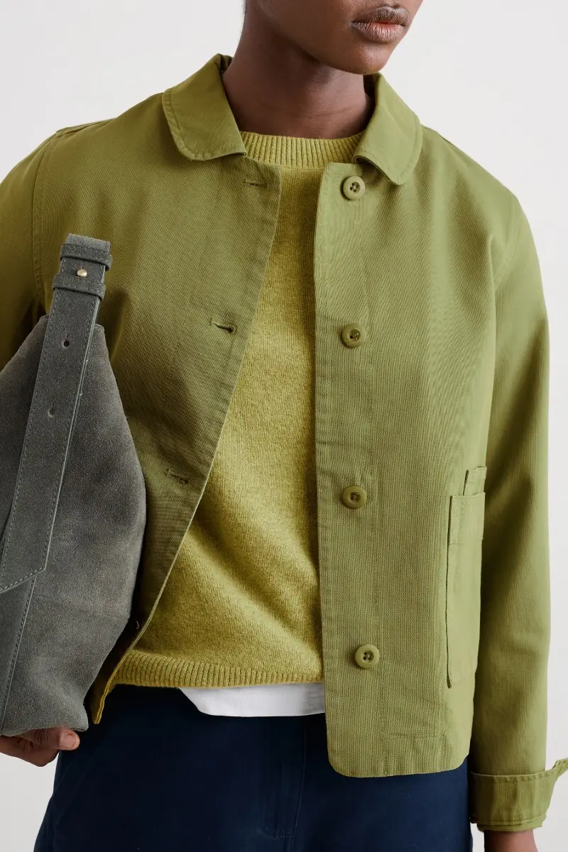 Workwear inspired chore jacket with a herringbone texture finish. Simple and easy style that’s a great alternative to a denim jacket.