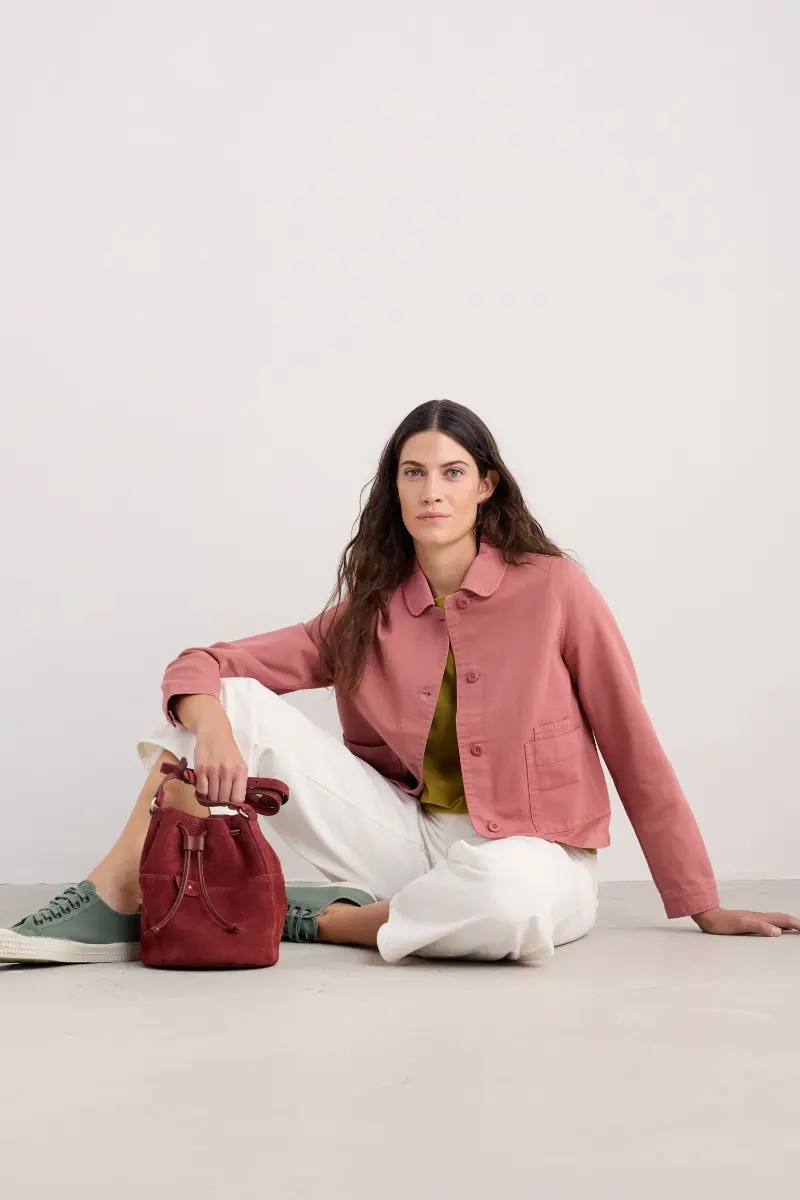 Workwear inspired chore jacket with a herringbone texture finish. Simple and easy style that’s a great alternative to a denim jacket.
