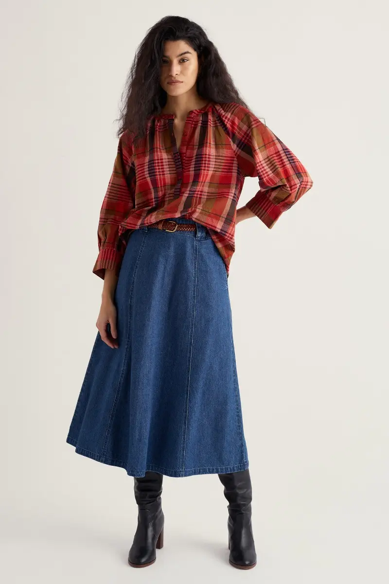 An ankle-length A-line skirt made with organic cotton stretch denim. Panel details emphasise the full, flared shape.