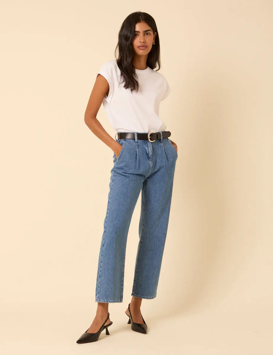 Blue Pleated Straight Leg Jeans