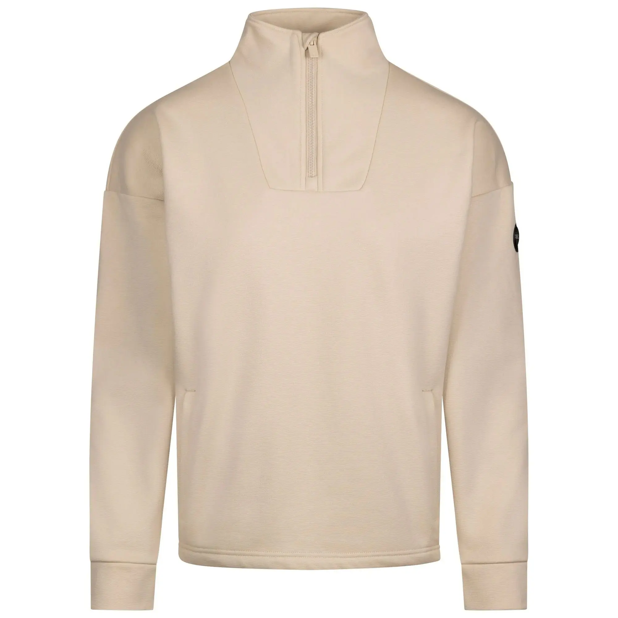 70% Polyester, 28% Cotton, 2% Elastane. Fabric: Brushed Back, Fleece, Soft Touch. Design: Badge, Plain. Fabric Technology: DLX, Ventilated. Drop Shoulder. Sleeve-Type: Long-Sleeved. Neckline: Standing Collar. Fit: Snug Fit. Pockets: 2 Lower Pockets. Fastening: Pull Over, Quarter Zip. XS: 32 in. S: 34 in. M: 36 in. L: 38 in. XL: 40 in. XXL: 42 in.