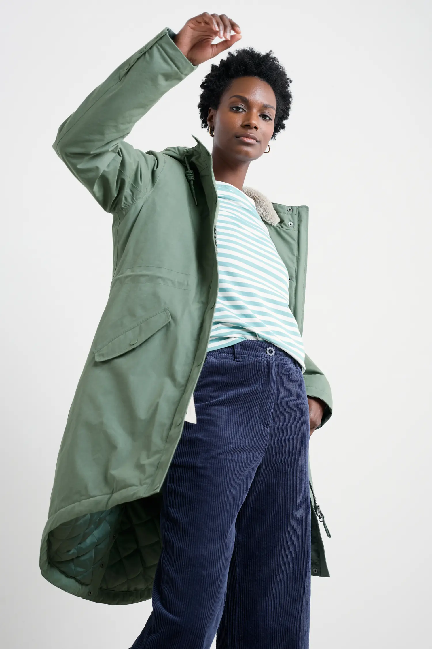 A warm and waterproof raincoat with a gently fitted shape, crafted from a soft blend of organic cotton and recycled fibres.
