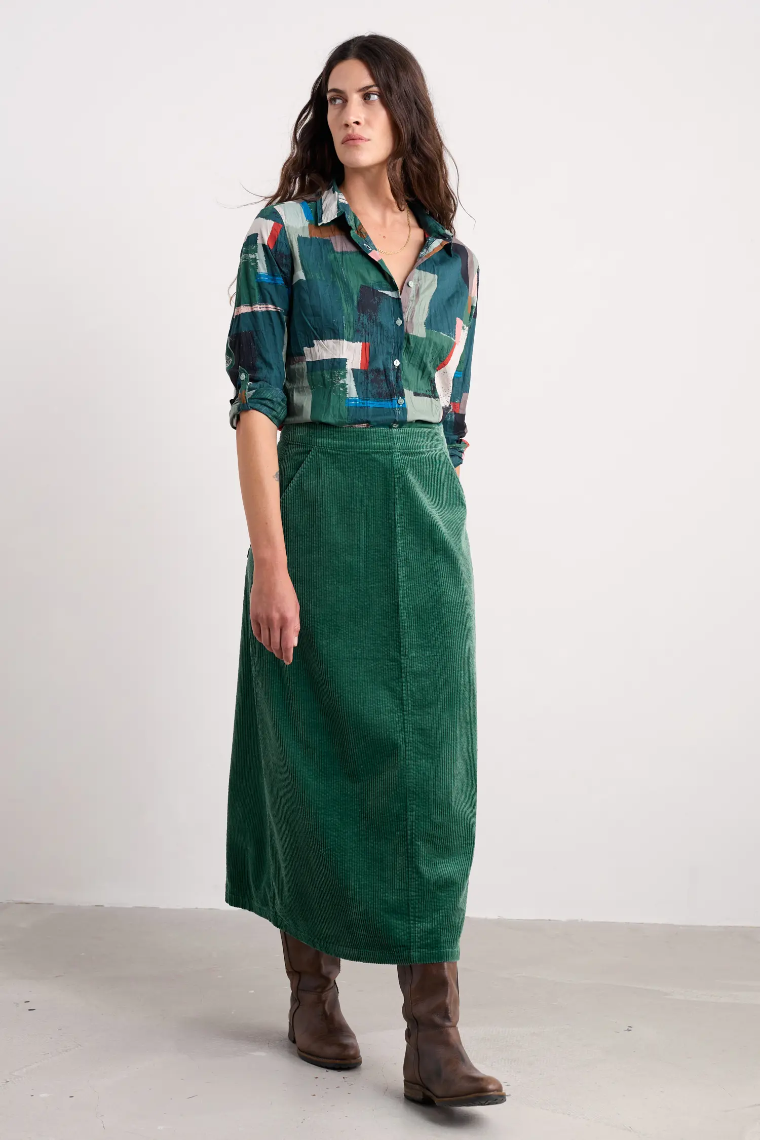 A velvety soft organic cotton cord A-line skirt, in a versatile midi length.