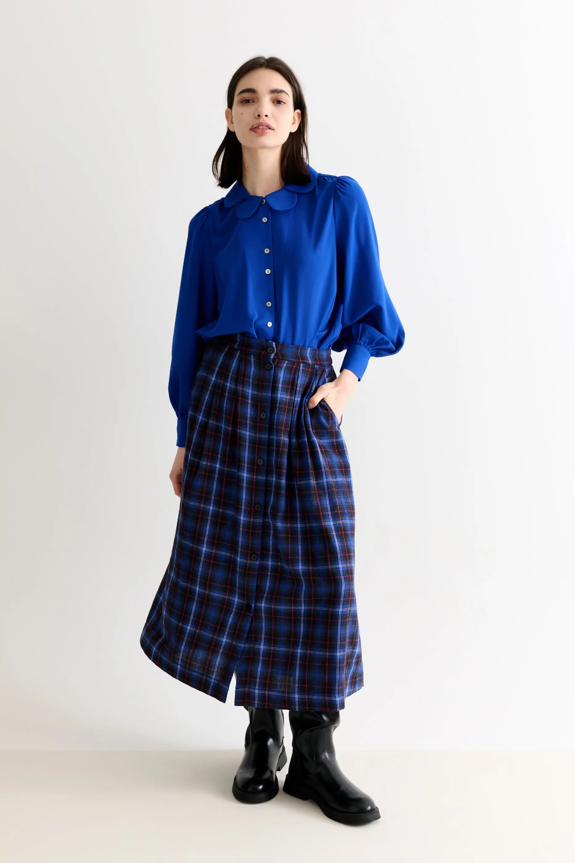 The Bia Blue Winter Check button through midaxi skirt is the perfect autumn essential. Its wide hem adds a playful touch, making it easy to style with our bright blue Octavia blouse or your favourite black polo neck top. Ready to take you from crisp mornings to cosy evenings in effortless style.. Front button opening. Pleated front.. Back elasticated waist.. 2 pockets. 30% COTTON, 70% POLYESTER, softly brushed woven check.. Cool machine wash. Wash with similar colours. Do not bleach. Do not tumble dry. Warm iron on reverse.. MODEL 5ft 8" 173cms, Size UK 8