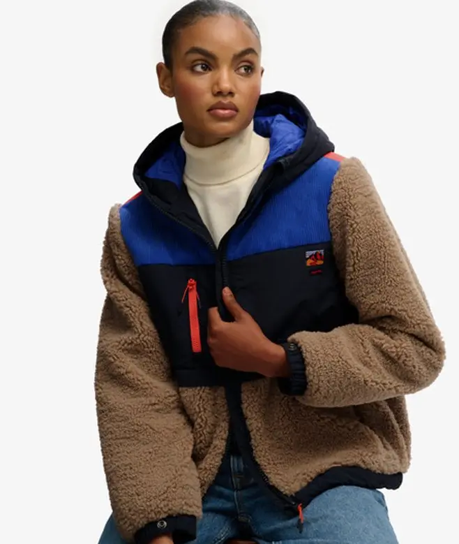 Relaxed fit - the classic Superdry fit. Not too slim, not too loose, just right. Go for your normal size Hooded with zip through fastening Three external zip fastened pockets with a bungee adjustable hemline Popper adjustable cuffs Signature patch on the chest Crafted to be the ultimate seasonal companion. Our Hooded Fleece Jacket has been designed with colourful, textured panels that bring life and excitement into the jacket whilst the practical elements make the jacket an invaluable option for the coming season.