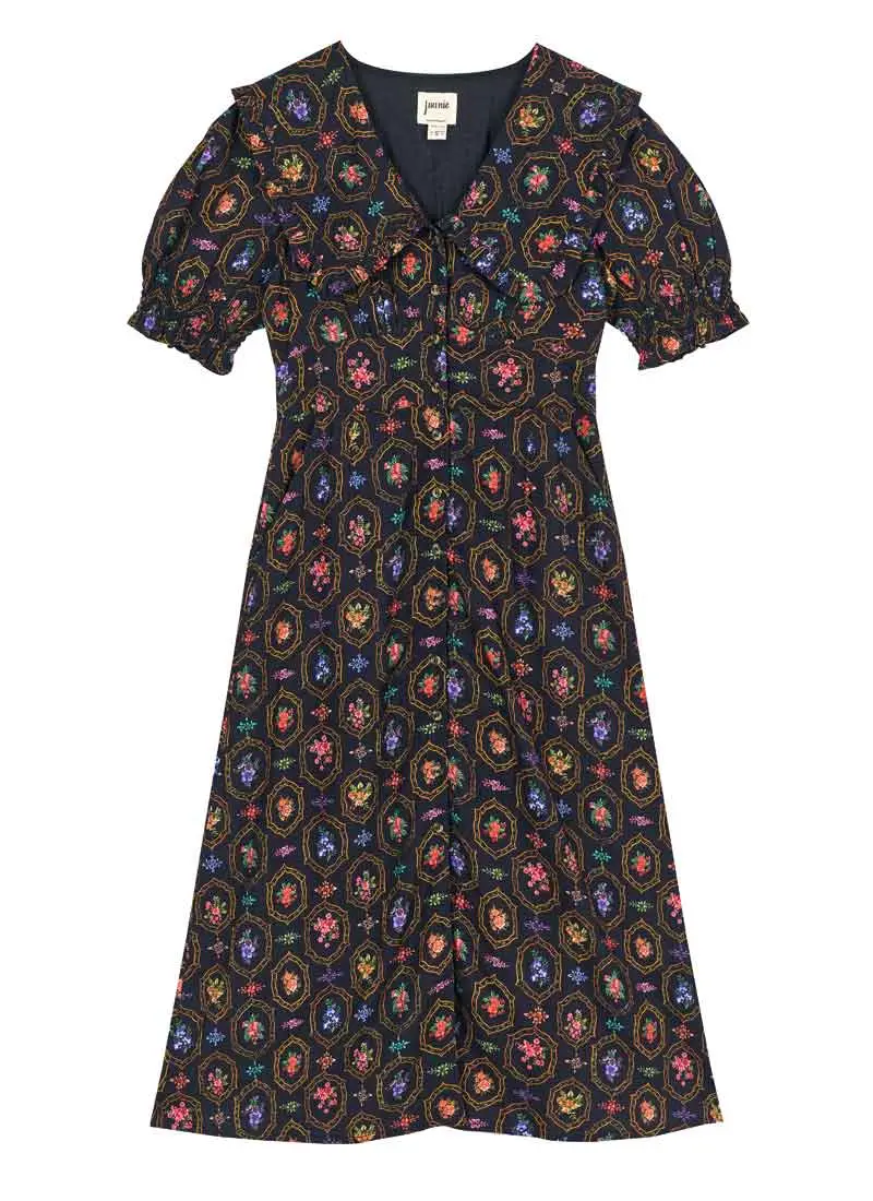 A lovely floral arrival. The Constance Dress is made from fabric with Livaeco™ Viscose fibres in an all-over vintage framed floral print depicting illustrated blooms inside antique picture frames on a dark blue background. Featuring a V-neckline, an oversized collar with frill detailing, voluminous short sleeves with elasticated shirring and frill detailing at the cuffs, a functional button-through front with horn-effect buttons, darts at the front and back waist to add shape, elasticated shirring to the back waist for adjustability, and slant pockets at the hips, this easy-to-wear midaxi dress is bound to be your new go-to!Lola is 5'10 and is wearing a UK size 16Matilda is 5'7 and is wearing a UK size 16Regular fit - take your usual sizeUK Size 10 dress length: 125cmAll-over antique framed floral printDark blue backgroundV-necklineShort puff sleeves with elasticated cuffsFunctional button-through frontElasticated back-waist shirringPocketsFor specific measurements of this garment, please see the Size Guide.