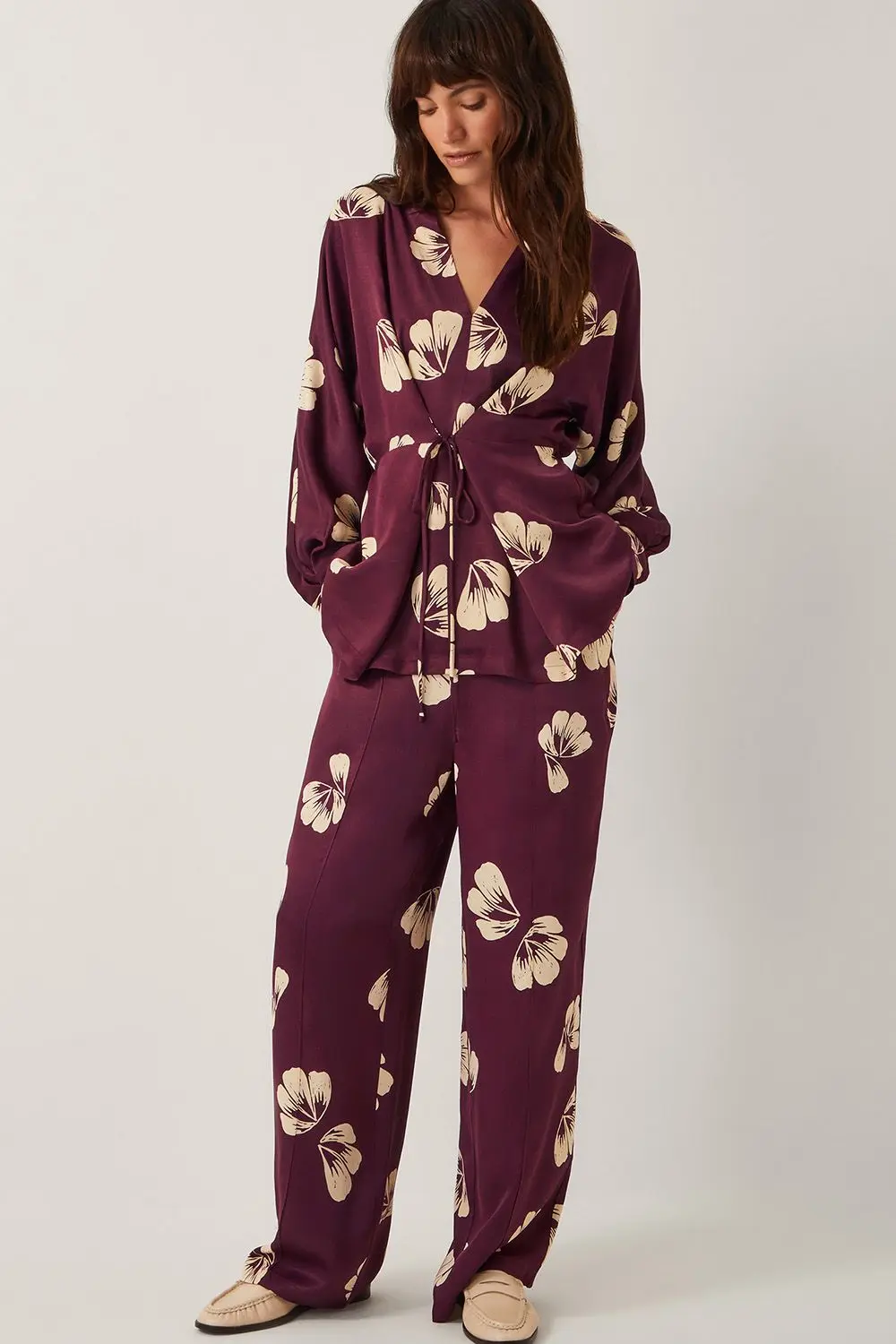 Bold, yet breezy. Printed with oversized florals on a delectable plum backdrop, these straight leg trousers boast a soft tailored finish with pockets, a structured waist, and button fastening to the front. Red