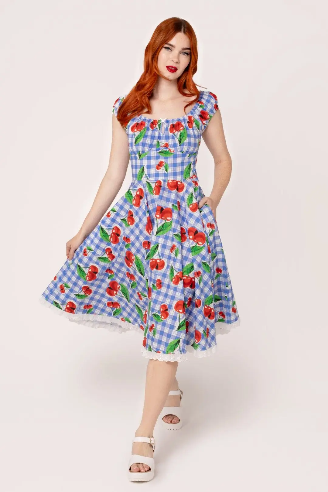 Printed cotton 50s style dress Large blue and white gingham with red cherries scattered Scooped neckline with ring keyhole, white bow detail on centre front Elasticated short puff sleeves that can be sat on or off the shoulder Fitted bodice that flares from the waistseam White scalloped trim around hem of skirt Full circle skirt, perfect for petticoats Pockets in side seams Zip fastening on centre back Fabric content: 98% Cotton 2% Elastane Fit advice: Fabric has stretch, stick to sizing advised on size guide for bust & waist, hip meaurement not needed as skirt is flared. Length: Skirt is 65cm from waistband to hem for size XS-M, Length of skirt is 67cm for size L-6XL Model: Emily S is 5.9ft and is wearing size XS, Penelope is 5.8ft and is wearing size 2XL