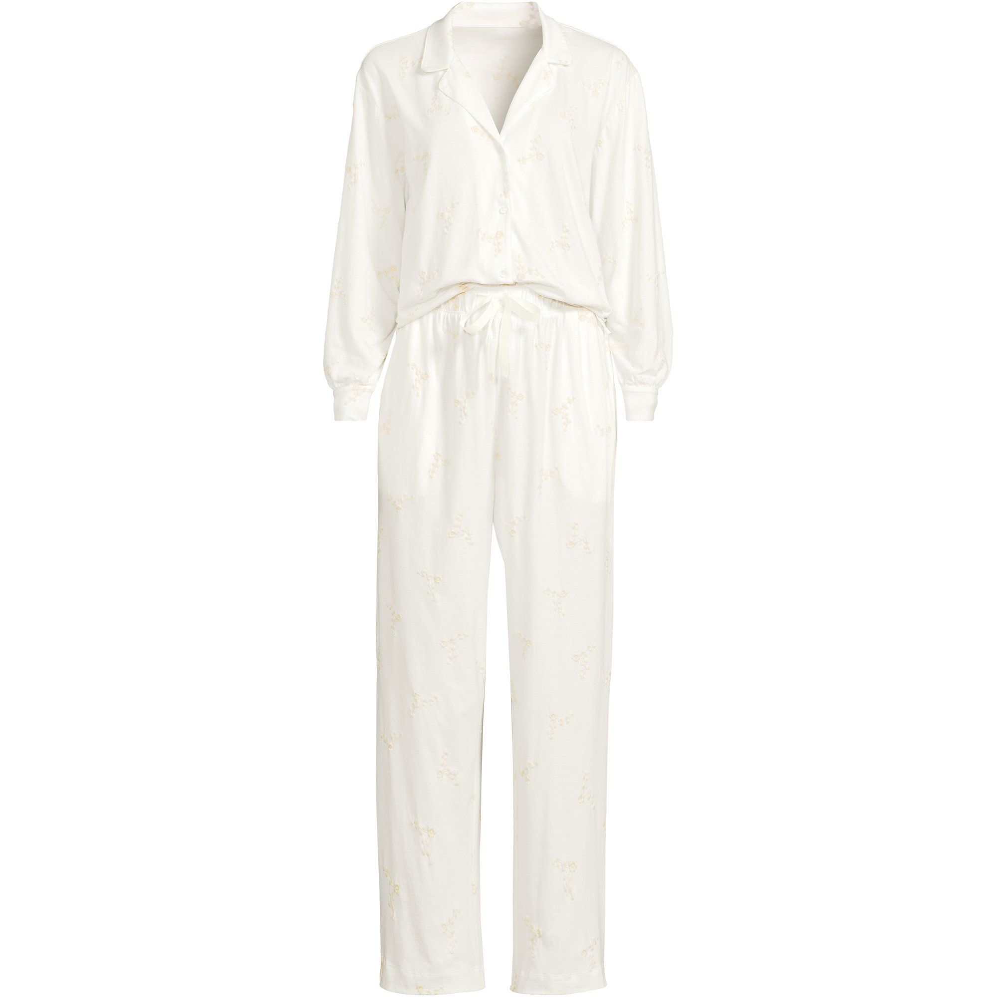Treat yourself to flowers that bloom forever. We stitched dainty floral embroidery all over the button-front top and pull-on bottoms of these pyjamas, using a contrasting white (or ivory) thread for vintage charm. | Lands' End Women's Embroidered Cotton Jersey Pyjama Set in Ivory | Size: 20