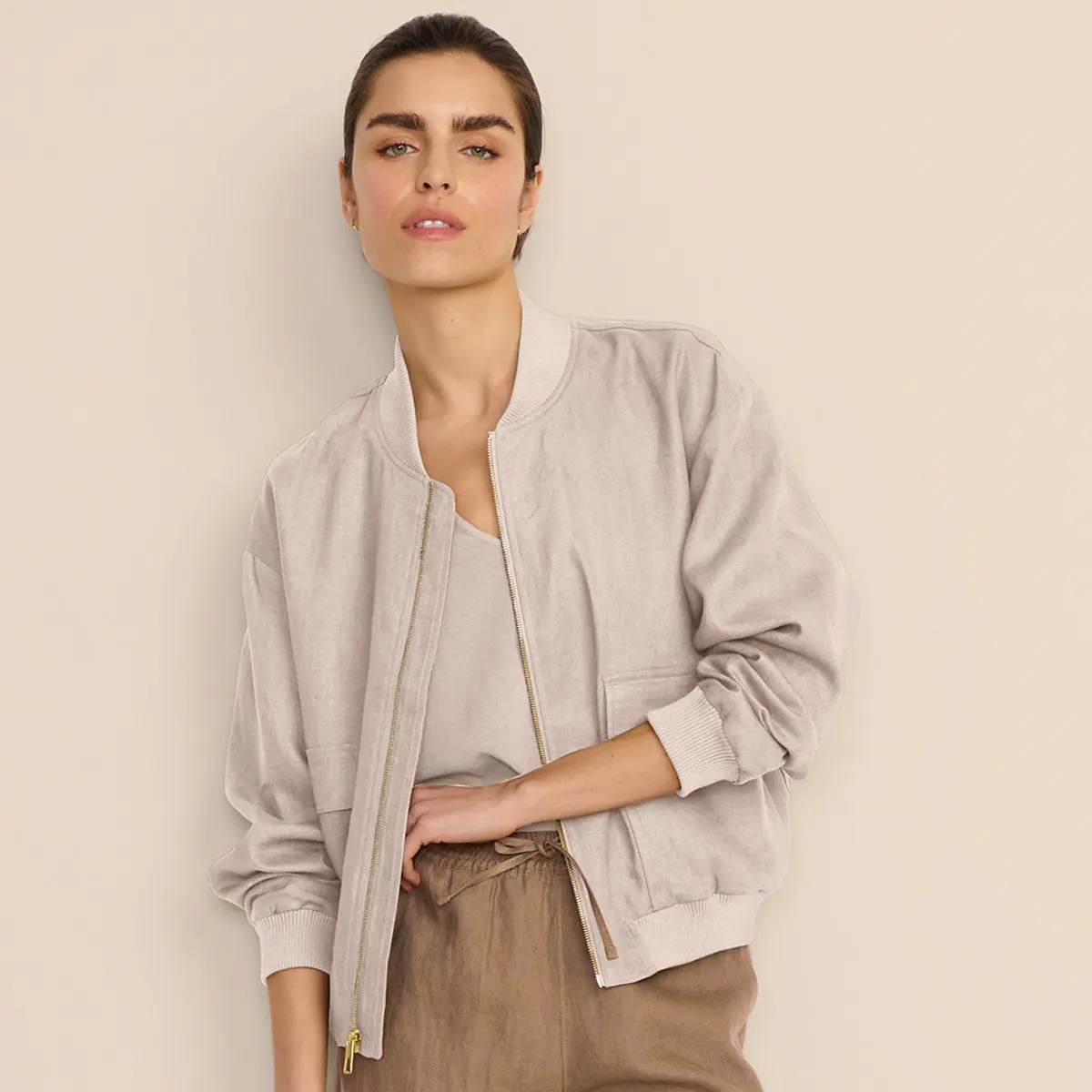 This on-trend bomber brings a whole new look to your wardrobe, and with all the coolness that linen brings. Versatile 2-way entry patch pockets are large and stylish, while ribbed trims offer enough stretch for a comfy fit. Wonderfully easy to wear with your favourite jeans, cargos or skirt.