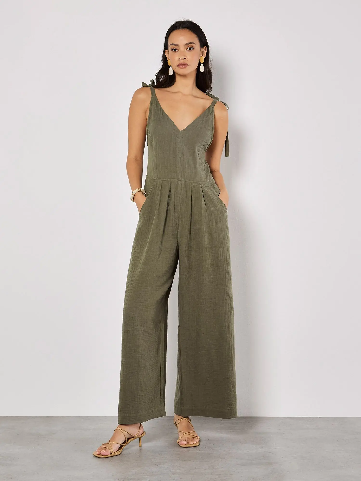 Apricot Women's Textured Cotton Wide Leg Jumpsuit in Khaki