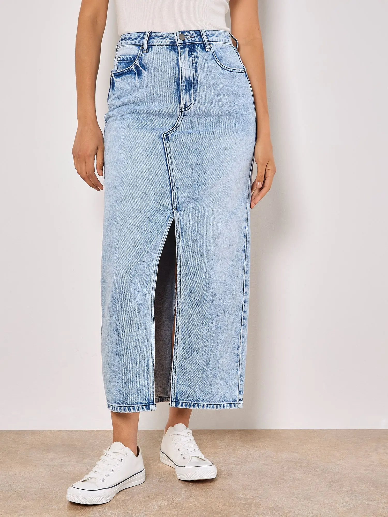 Crafted from pure cotton to a soft finish, this denim skirt falls to a flattering maxi length. It features a button and zip fastening, four pockets, and a front split for movement and style.
