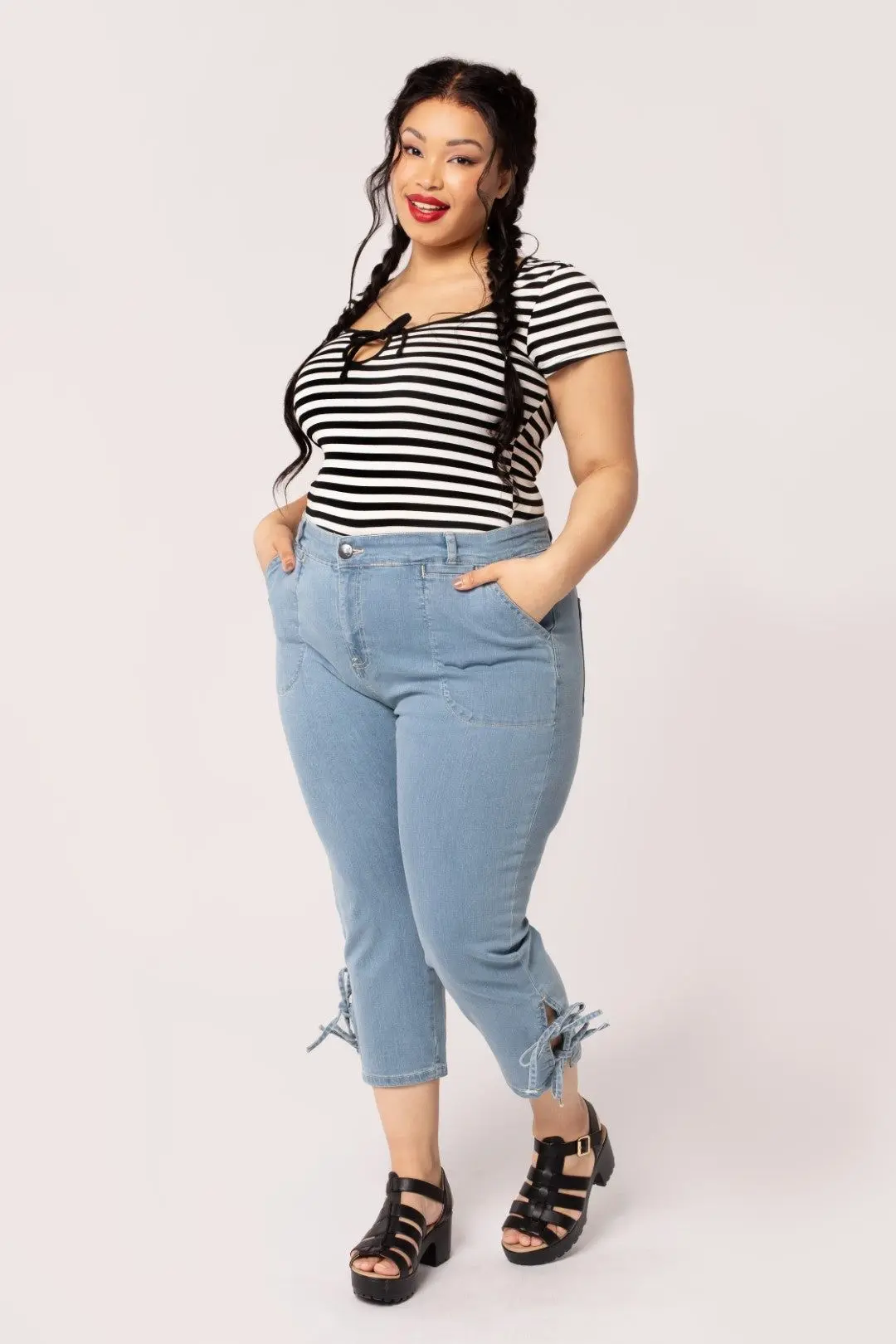 Stretchy light blue denim jeans Cropped length with side spilt and 2 ties in self fabric detailing Waistband with belt loops Button & zip fastening on centre front Pockets on front Two pockets on front & back of jeans Fabric content: 98% Cotton 2% Elastane Fit advice: Fabric has slight stretch, stick to sizing advised on size guide for waist & hips, if inbetween sizes, choose the size up Length: Outside leg is 84cm on size small, gets slightly longer per size Model: Maisie is 5.8ft and wears a size XS