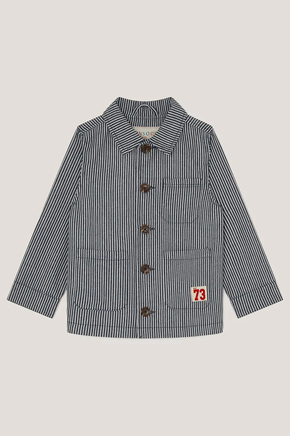 Cool dude. A smart jacket for them to wear when the weather's not too hot and not too cold. It's designed with a classic collar, three patch pockets, front button fastenings and navy pinstripes. Blue