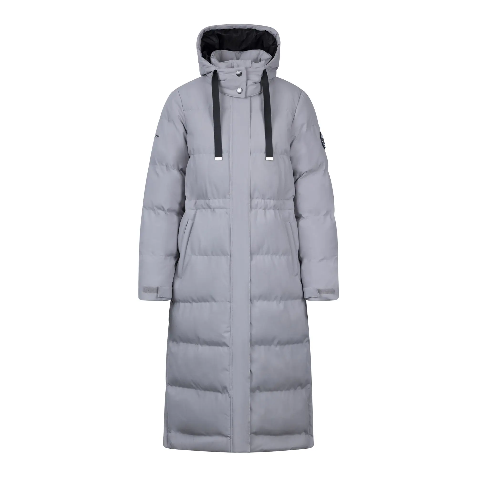 100% Polyester. Shell: Woven. Filling: Faux Down. Fabric: TPU Membrane. Design: Badge, Logo, Quilted. Fabric Technology: Durable, Insulating, Lightweight, Waterproof. Cuff: Adjustable, Hook And Loop Strap. Neckline: Hooded, Standing Collar. Inner Waist Drawcord, Padded. Sleeve-Type: Long-Sleeved. Hood Features: Adjustable, Drawcord, Grown On Hood. Length: Longline. Pockets: 2 Side Pockets, Zip, Tricot Lined. Fastening: Concealed, Press Stud, Stormflap. Hem: Side Zip. XXS: 31 in. XS: 32 in. S: 34 in. M: 36 in. L: 38 in. XL: 40 in. XXL: 42 in. 3XL: 44 in.