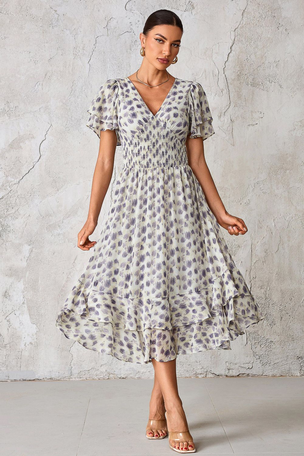 Fall in love with our Frill Hem Chiffon Midi Dress from Jolie Moi, the newest addition to your staple occasion wardrobe. Adorned in a beautiful abstract animal print with gold fleck detailing, this midi dress falls to the perfect length, crafted from soft airy chiffon. The double layered angel sleeves are complimented by a flattering shirred waistband that shapes the body perfectly, as well as featuring a frill hem for that feminine flare. This over the head style has a v neck both front and back for easy wearing, as well as discreet side front pockets.