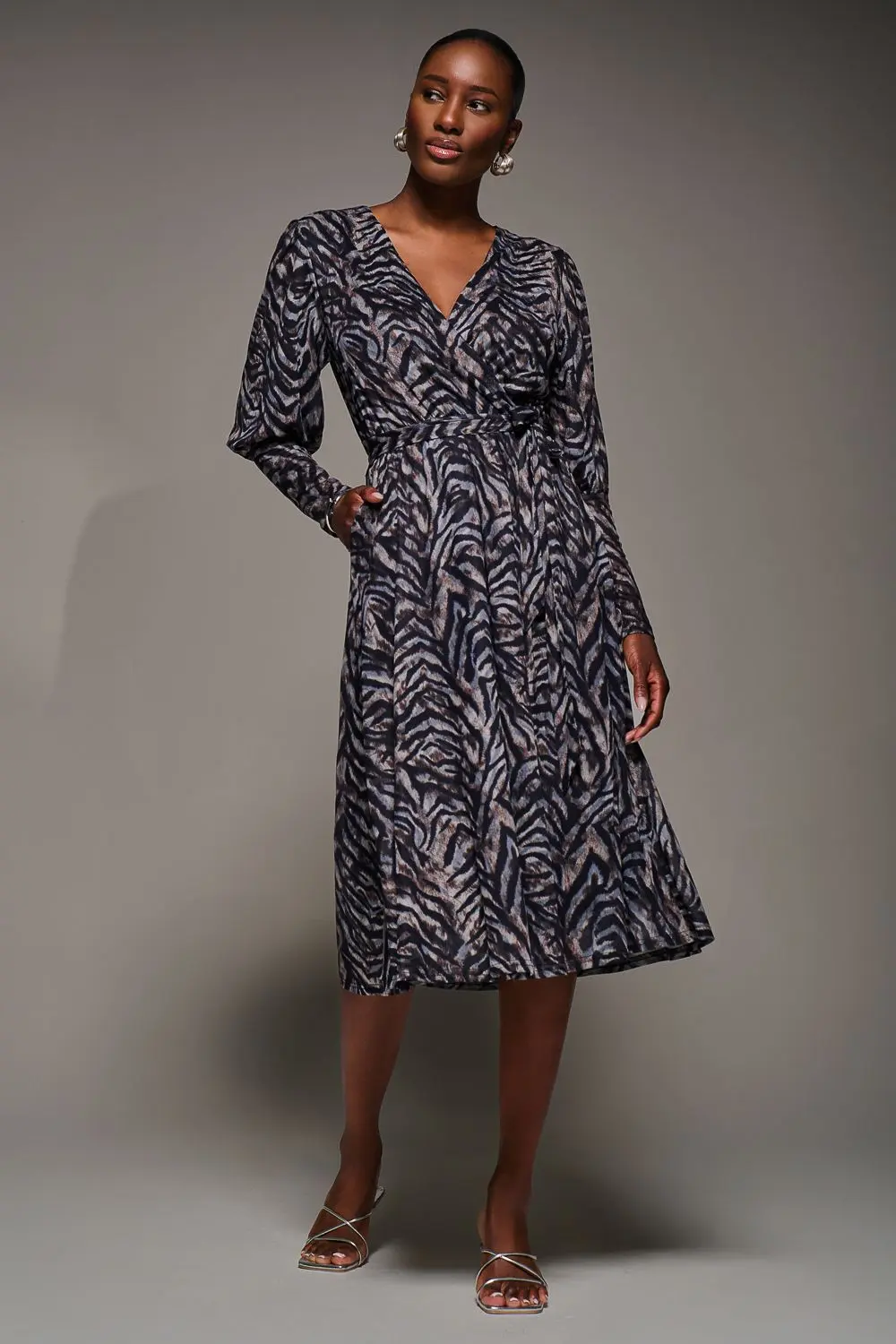 The Mesh Puff Sleeve Dress by Jolie Moi features sheer mesh long puff sleeves and a flattering wrap-style front with two discreet side pockets. An elastic waistband and tie-back detail accentuate the waist, creating a beautifully defined silhouette.