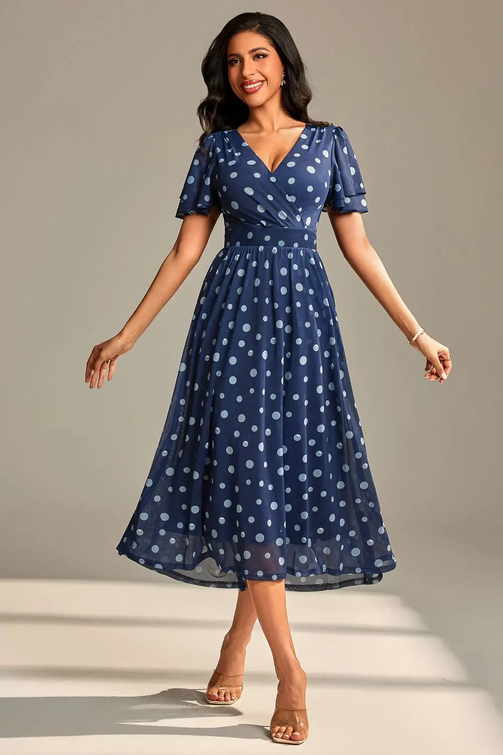 Jolie Moi Women's Flutter Sleeve Mesh Maxi Dress in Navy