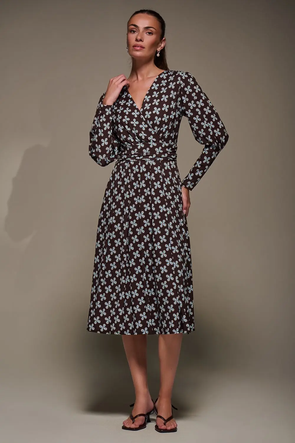 The Puff Long Sleeve Jersey Midi Dress by Jolie Moi features an elegant wrap-style front and a flattering V-neckline. The gently gathered waistband drapes beautifully, while the pleated detailing at the waist adds graceful movement. This design includes two pockets.