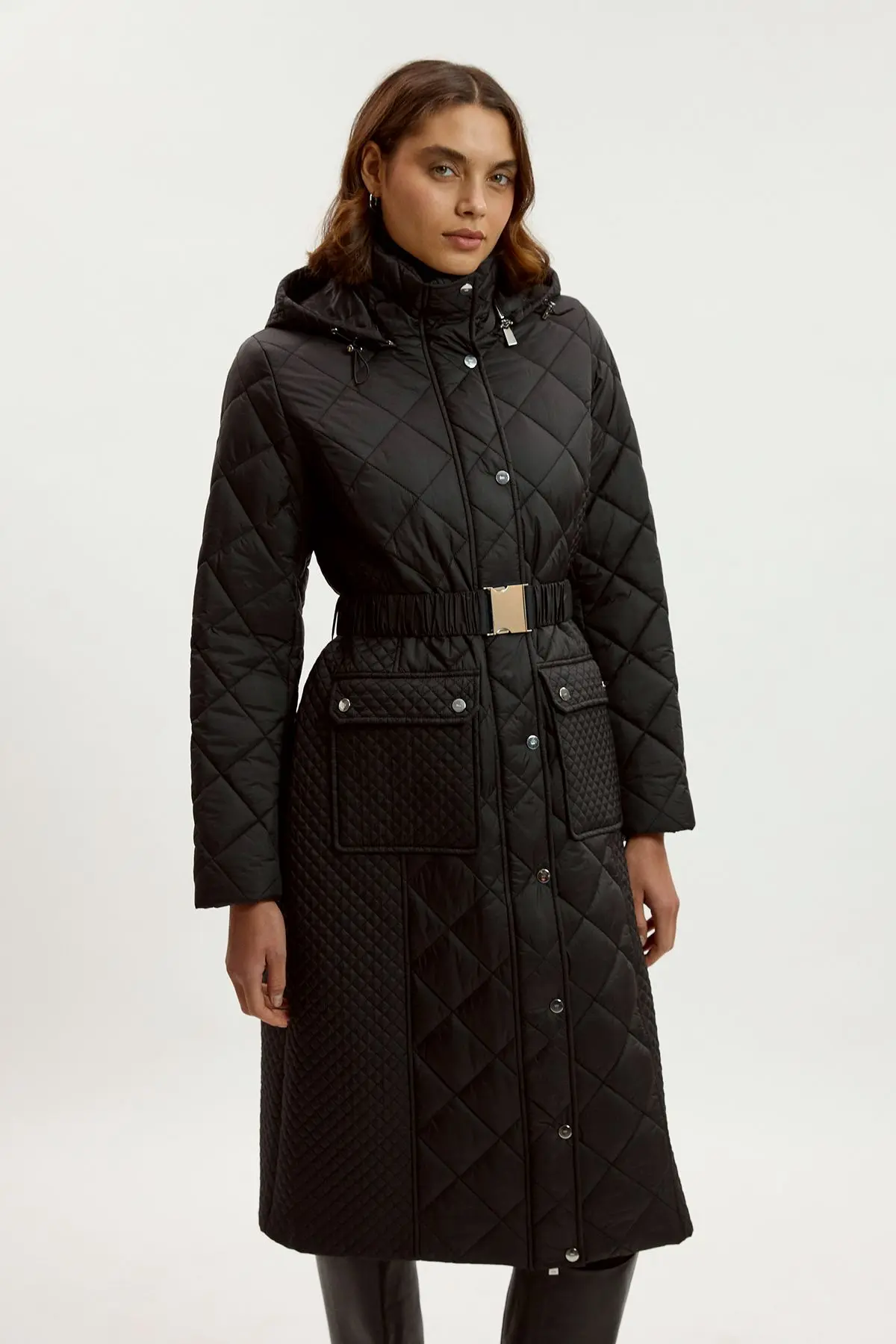 Quilted Hooded Longline Coat - Black - This Karen Millen quilted longline coat combines practicality with sophisticated style. The diamond quilting creates visual interest while providing essential warmth for cooler days. The adjustable belt cinches the waist, creating a feminine silhouette despite the coat's substantial coverage. The thoughtful design details, including the protective funnel neck and practical pockets, demonstrate the expert craftsmanship that Karen Millen is known for, ensuring this coat remains a wardrobe staple for seasons to come. Longline quilted coat with diamond pattern Practical funnel neck design Flattering belted waist Functional front pockets Full-length design
