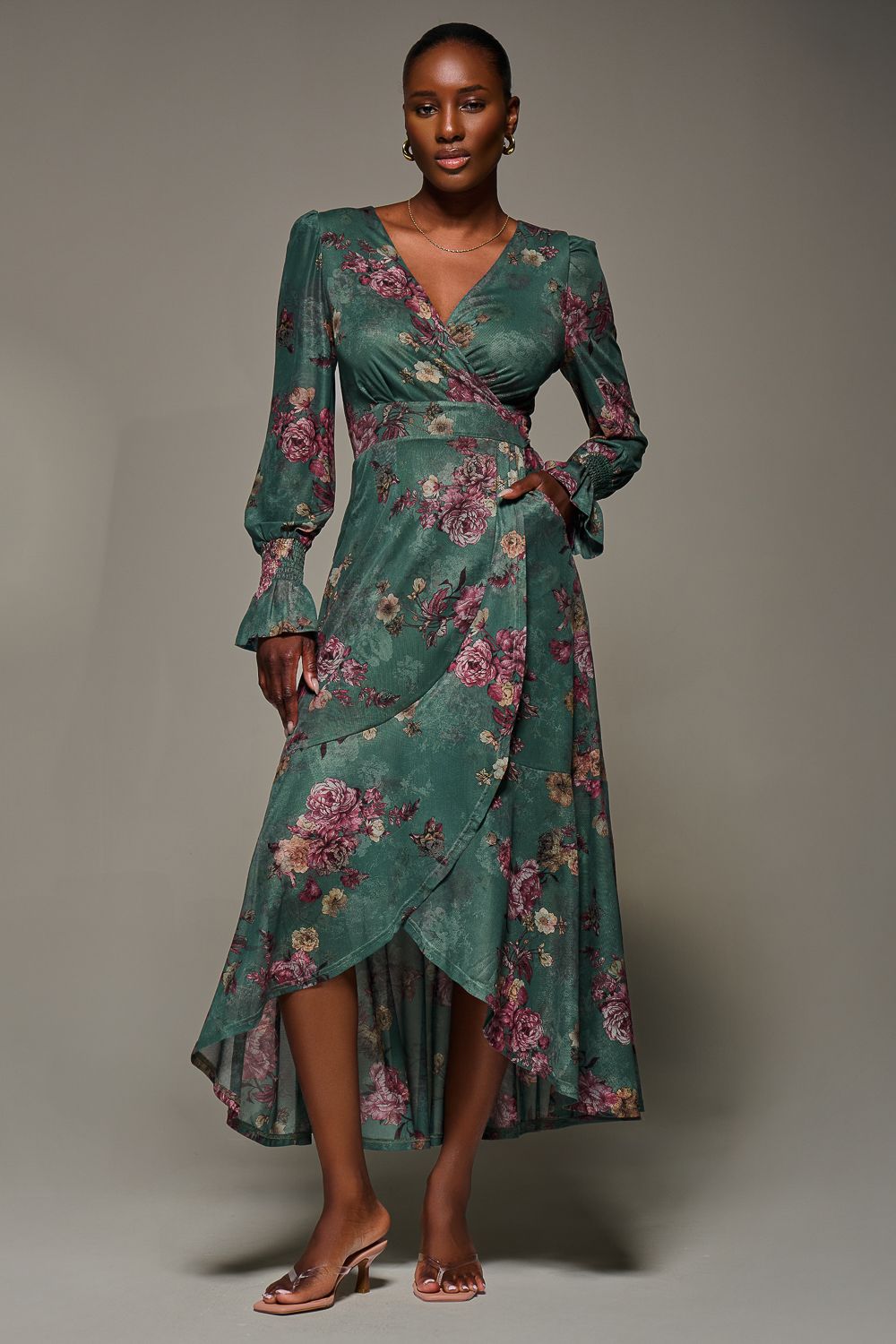 Long Sleeve Frill Hem Mesh Maxi Dress by Jolie Moi features a wrap-style front with a V-neckline, thick waistband, and two side pockets. The long sleeves have shirred cuffs that flare out, and the wrap-style skirt is detailed with frills starting at the waistband and extending to the hem, forming a shorter front length.