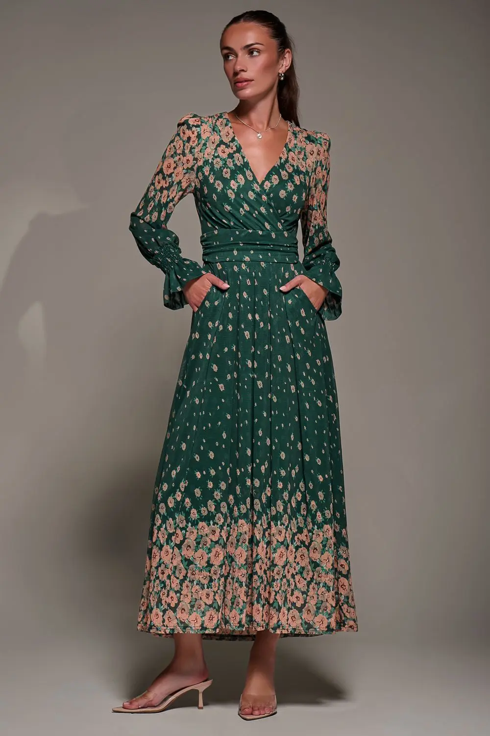 The Mirrored Print Long Sleeve Mesh Maxi Dress by Jolie Moi features a flattering wrap-style front with a V neckline. The thicker waistband is gathered at the sides, creating a draped effect, and includes a tie for added detail. The skirt features gentle pleats and two side pockets for convenience. The sleeves are slightly sheer, with shirring starting at the wrist and gently flaring out, adding a touch of elegance. With its slightly shorter front hemline, this dress is perfect for both casual and formal occasions.