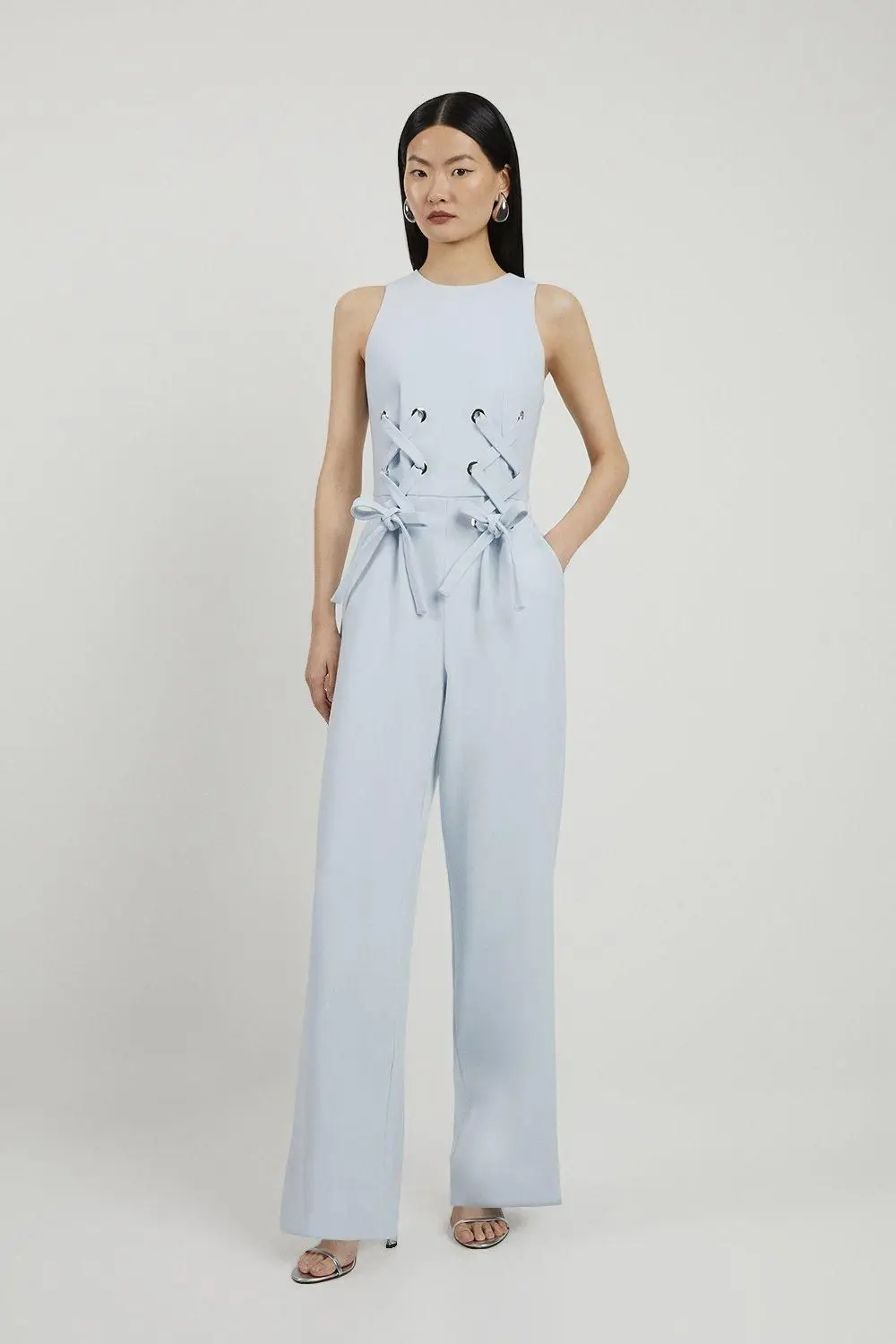 Compact Stretch Eyelet Detailed Ribbon Jumpsuit - Light Blue - Stray from tradition in a tailored jumpsuit, featuring a fitted bodice and relaxed, straight fit legs, as well as ribbon detailing in the front that is certain to attract attention. Styles well with anything, from heeled ankle boots to strappy sandals for looks that will see you from office days to evenings out. Compact Stretch Eyelet Detailed Ribbon Jumpsuit High Quality Stretch Fabric Figure Hugging Bodice Unique Ribbon Lacing in Front Relaxed Straight Leg Fit Sleeveless Design Pocket Features