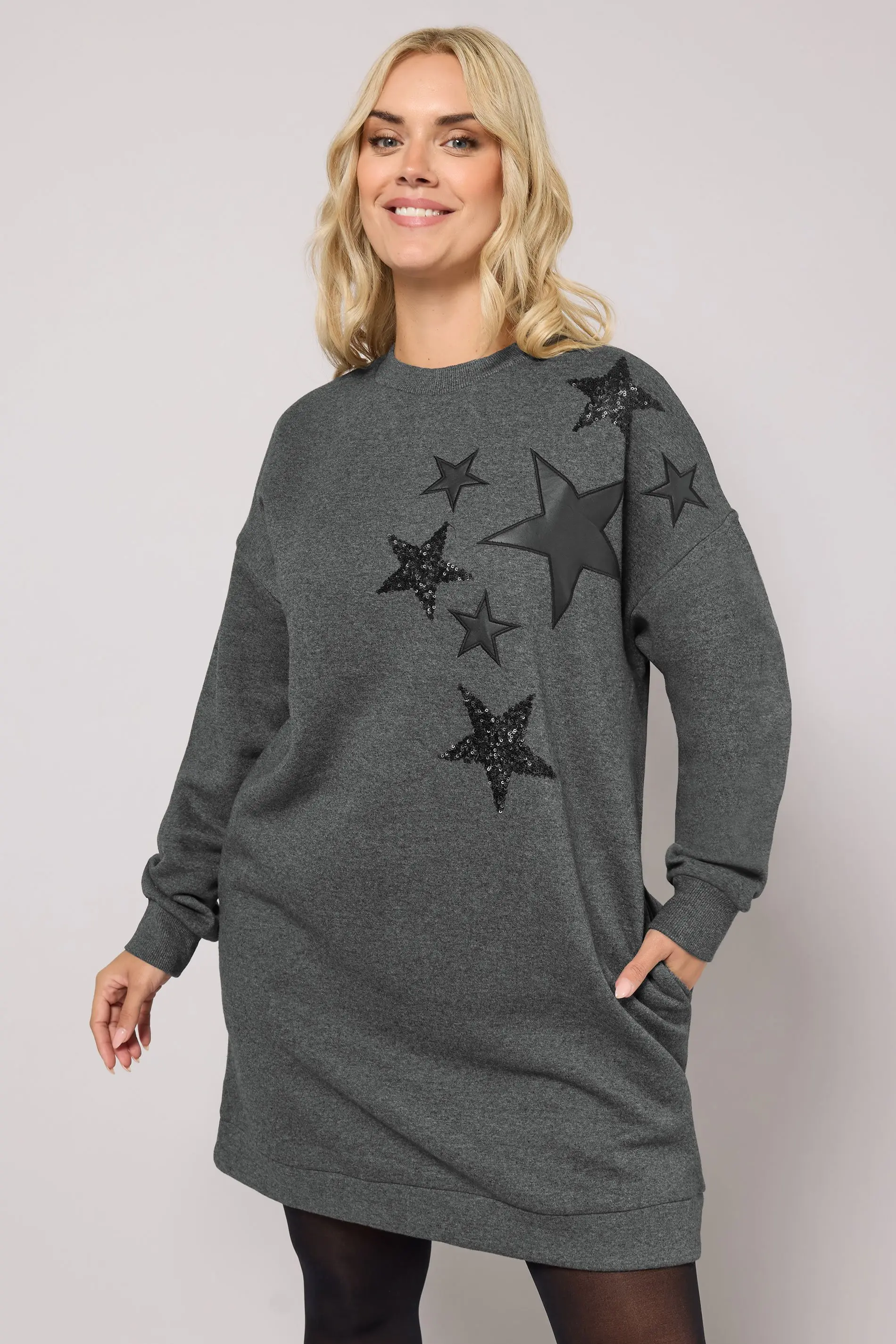 Your new go-to for laid-back days, this sweatshirt dress is all about comfort and ease. Made from a soft jersey fabric, it features star design with sequin detail, side pockets, long sleeves, a crew neckline and is complete in a mini length. Team with trainers for an effortless off-duty look. The perfect option to throw-on-and-go.